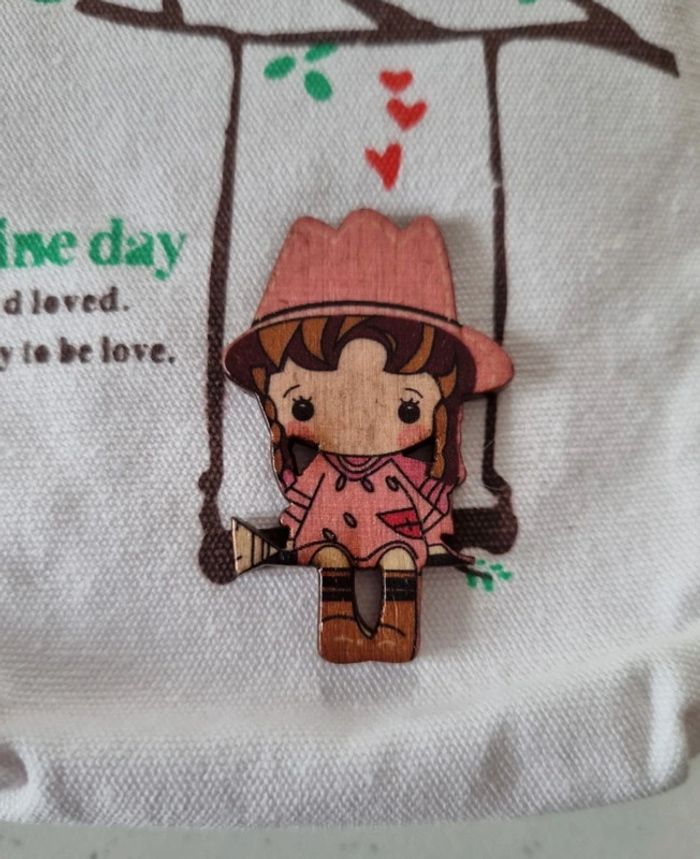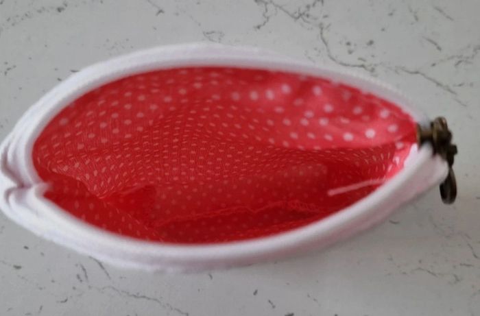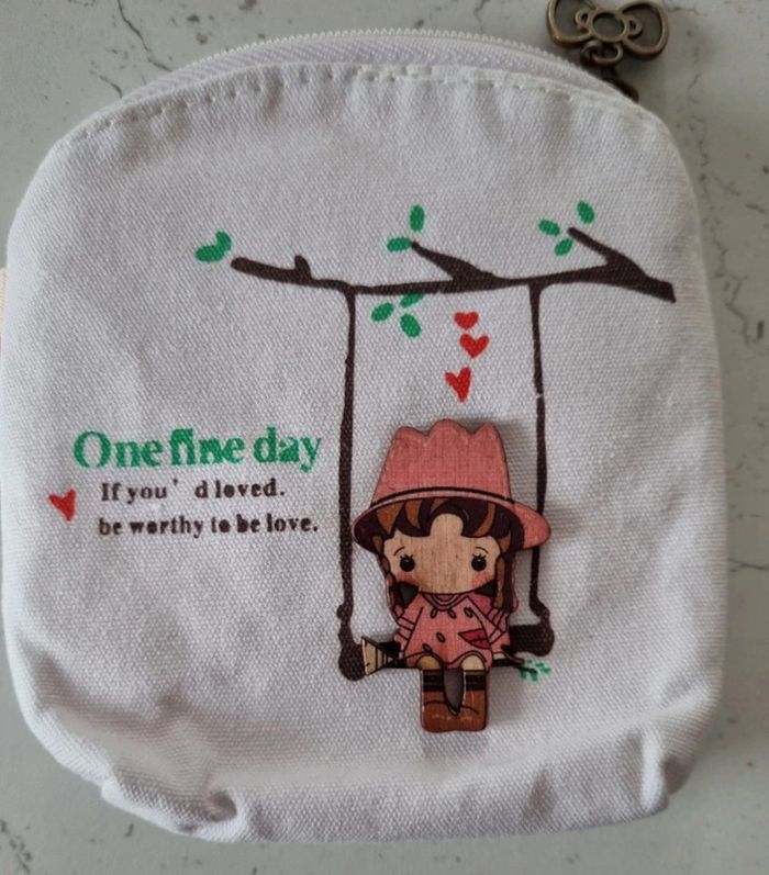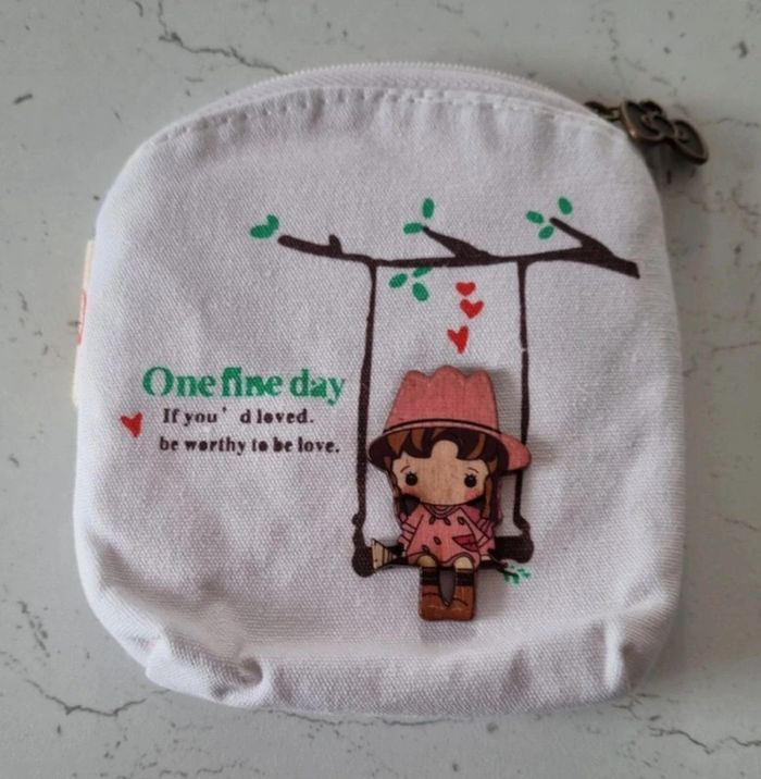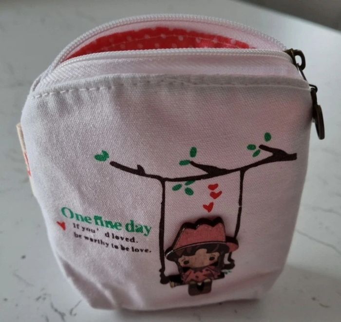 Porte monnaie fille blanc avec fermeture éclair Dimensions : 11X12 cm avec figurine petite fille en bois intérieur en tissu rose à petits pois Porte monnaie en coton