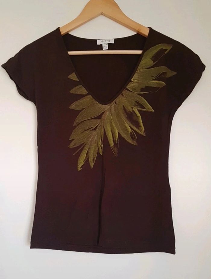 Tee shirt col V marron avec motif feuille vert kaki Taille 34/36 96% viscose et 4% elasthanne