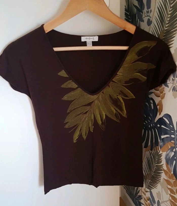 Tee shirt col V marron avec motif feuille - photo numéro 1