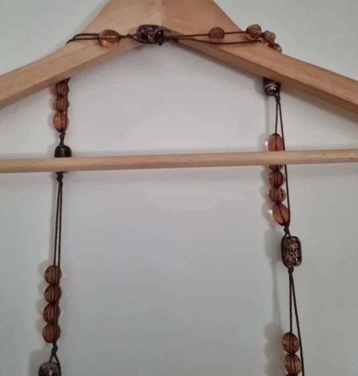 Sautoir long sur double fil de coton et perles marron de différentes formes et couleur Longueur : 75cm Peu porté, comme neuf