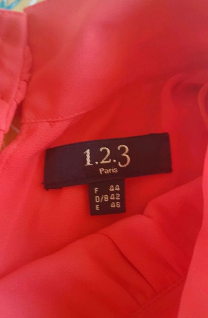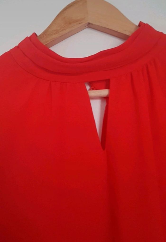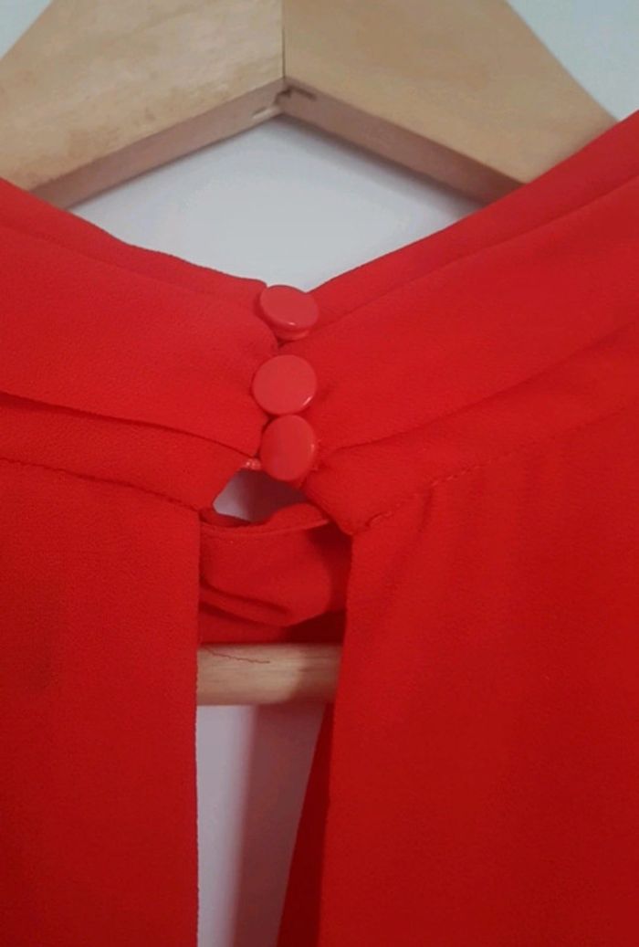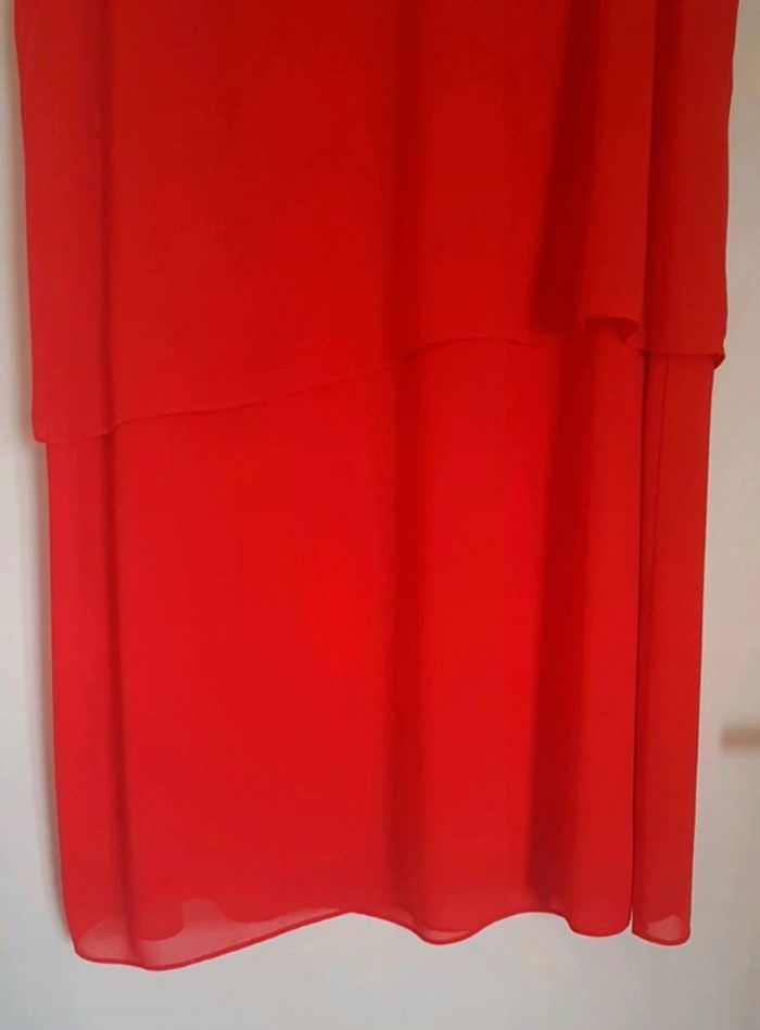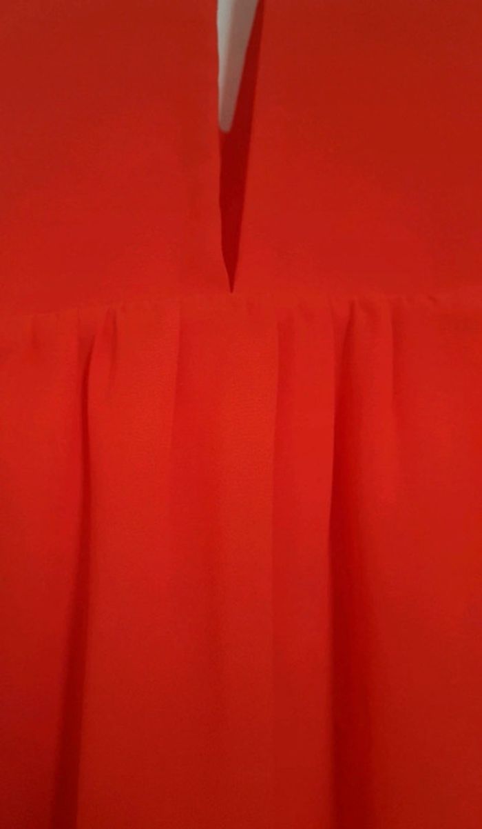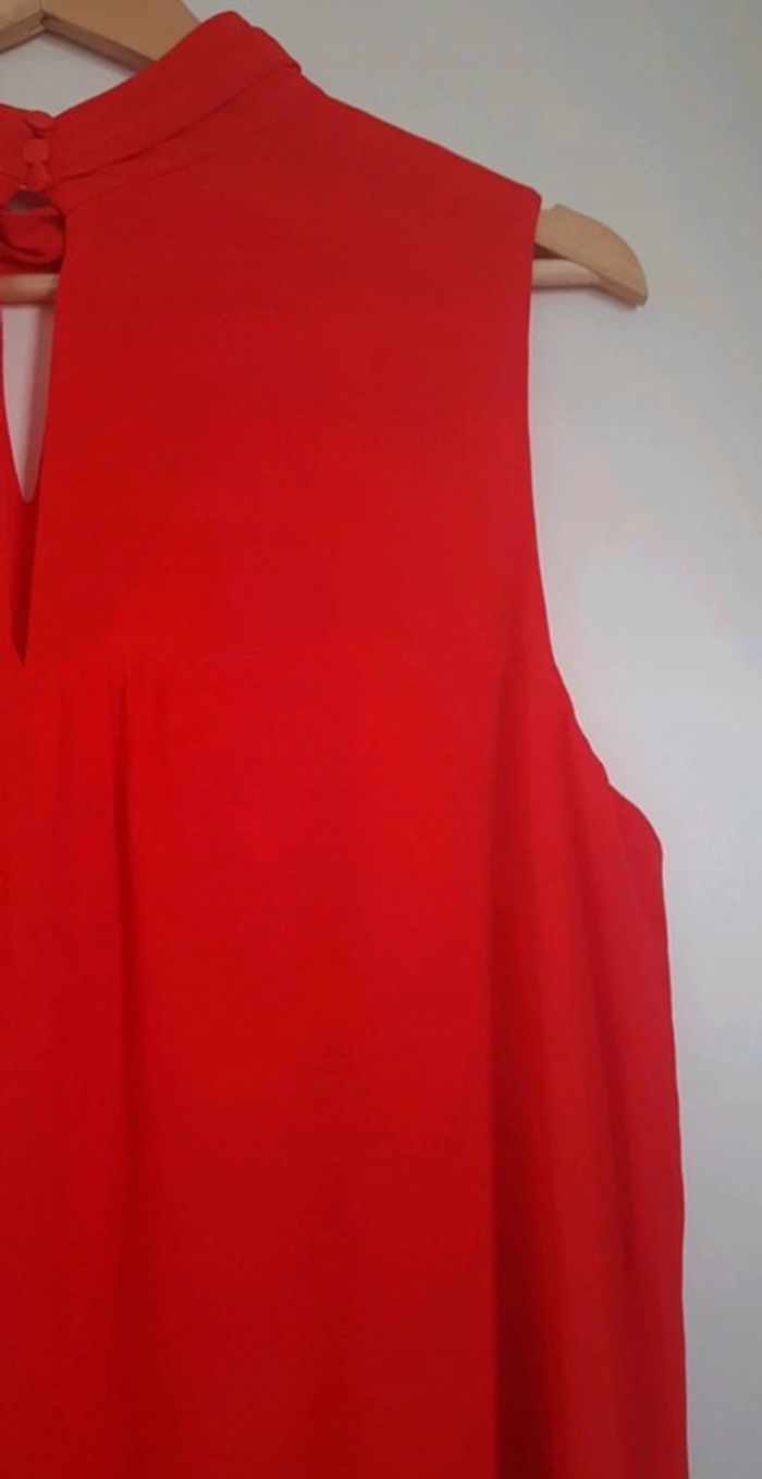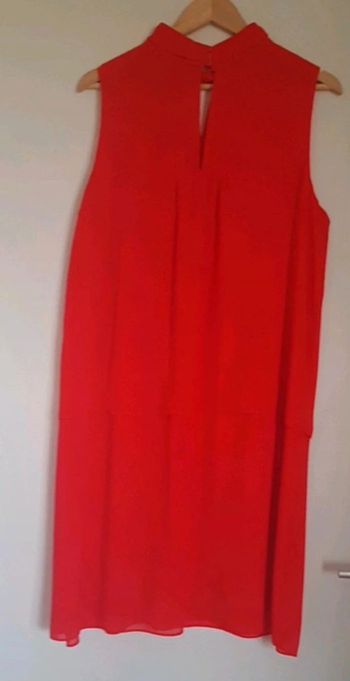 Robe rouge corail sans manches à volants Col montant S'attache au dos avec 3 boutons Longueur: environ 102 cm 100% polyester Taille 44