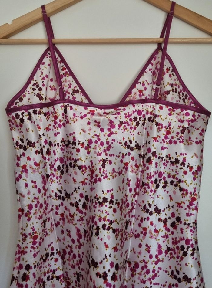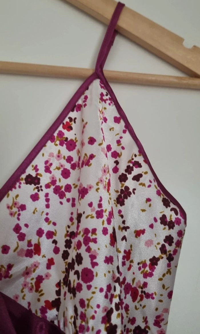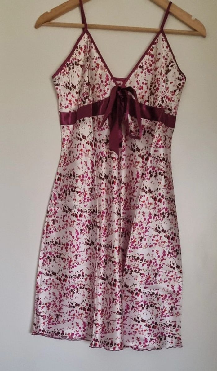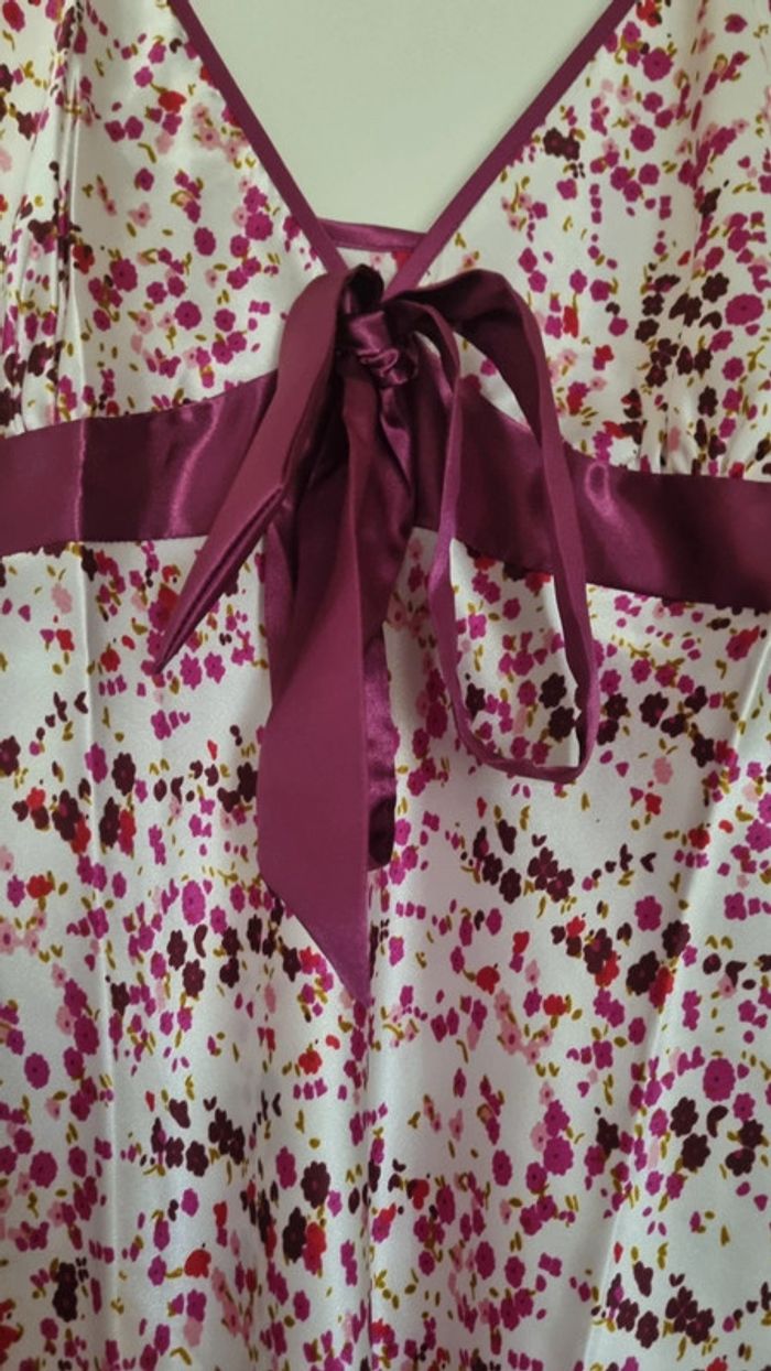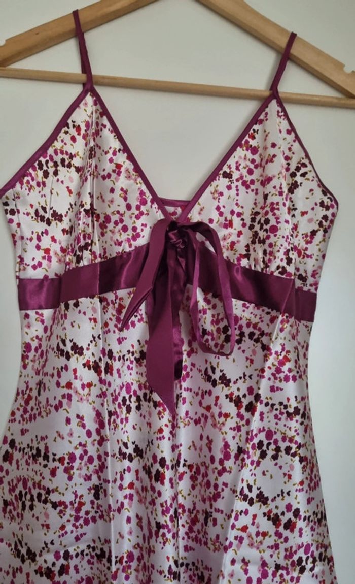 Nuisette à fleurs rose fushia avec bretelles fines réglables Avec noeud fushia à l'avant Matière : 100% polyester Taille 38/40 Longueur : 87 cm Neuve, jamais portée