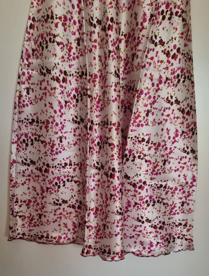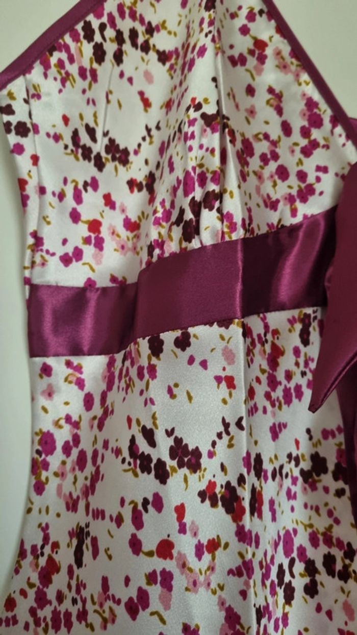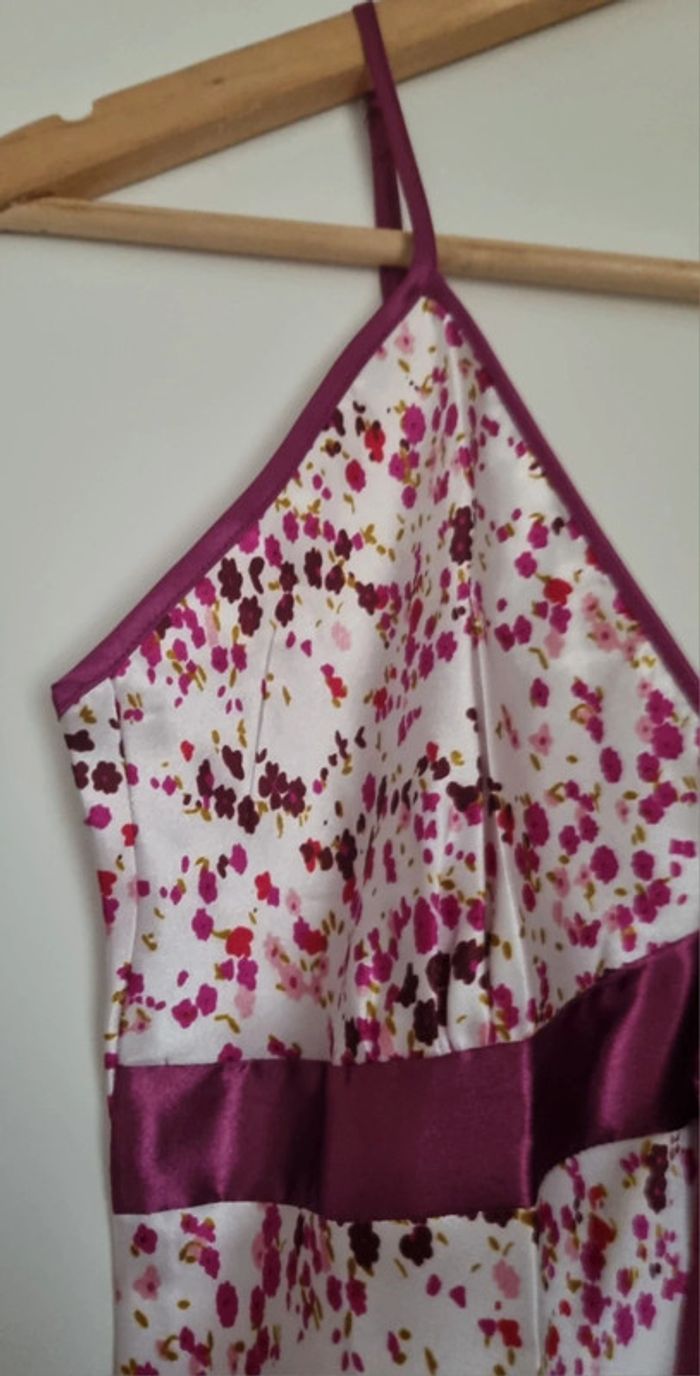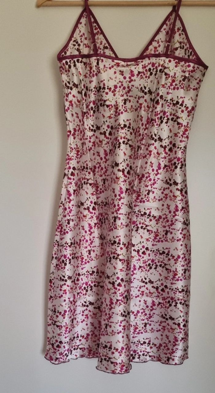 Nuisette à fleurs rose fushia avec bretelles fines réglables Avec noeud fushia à l'avant Matière : 100% polyester Taille 38/40 Longueur : 87 cm Neuve, jamais portée