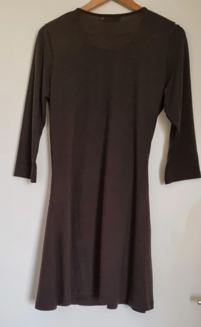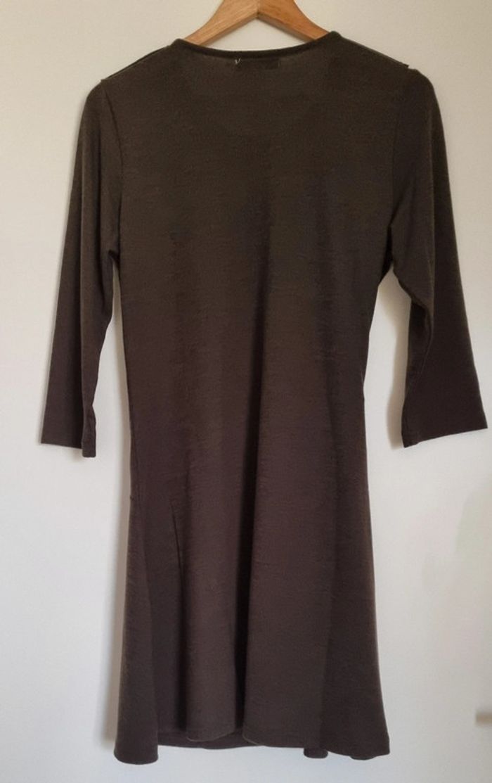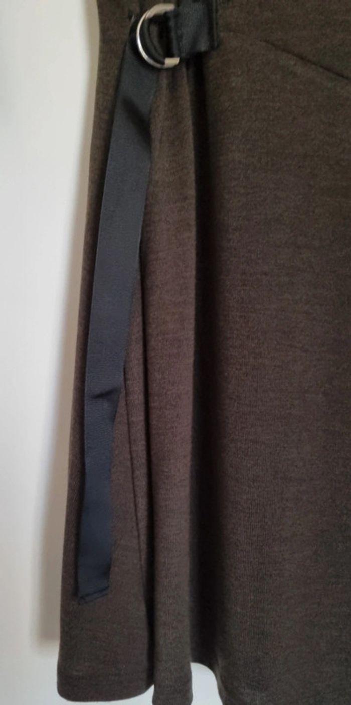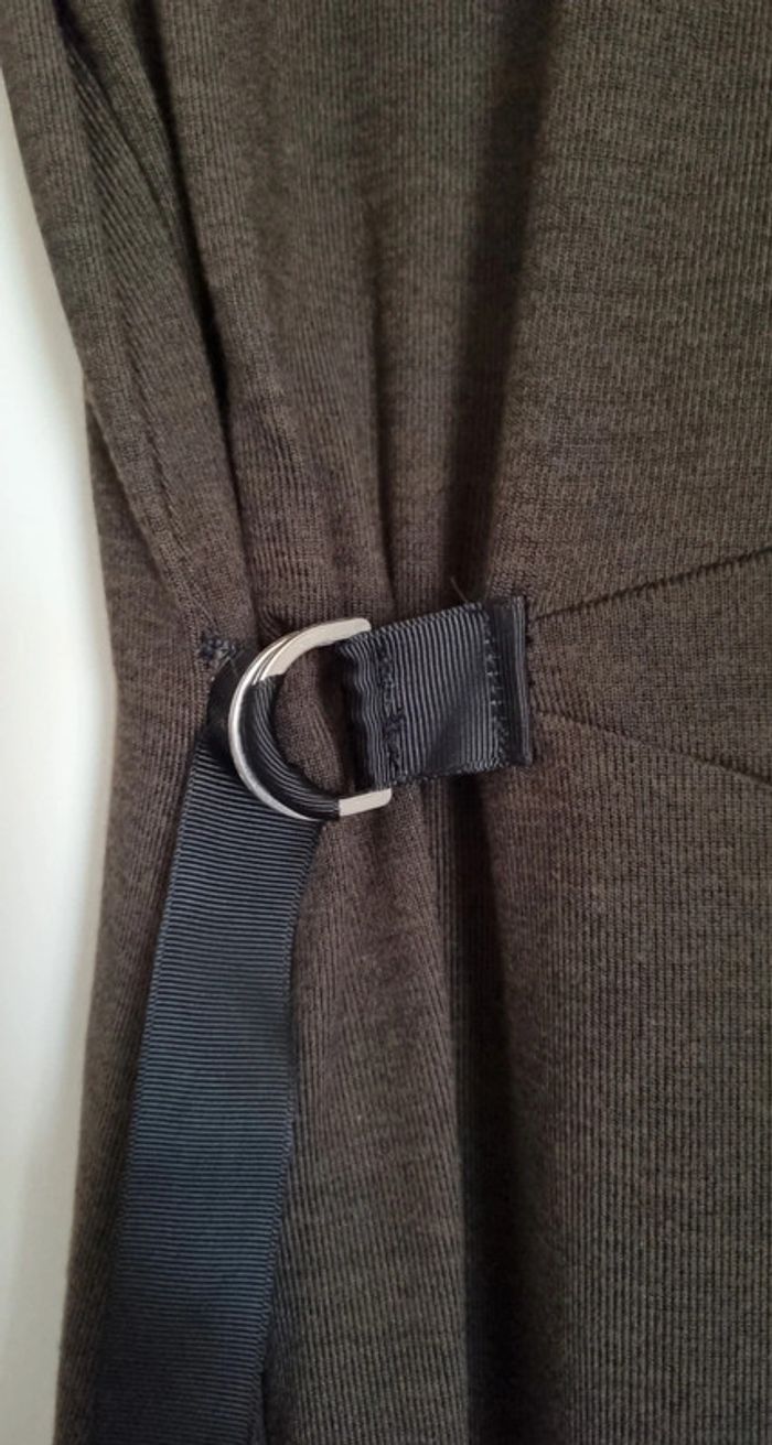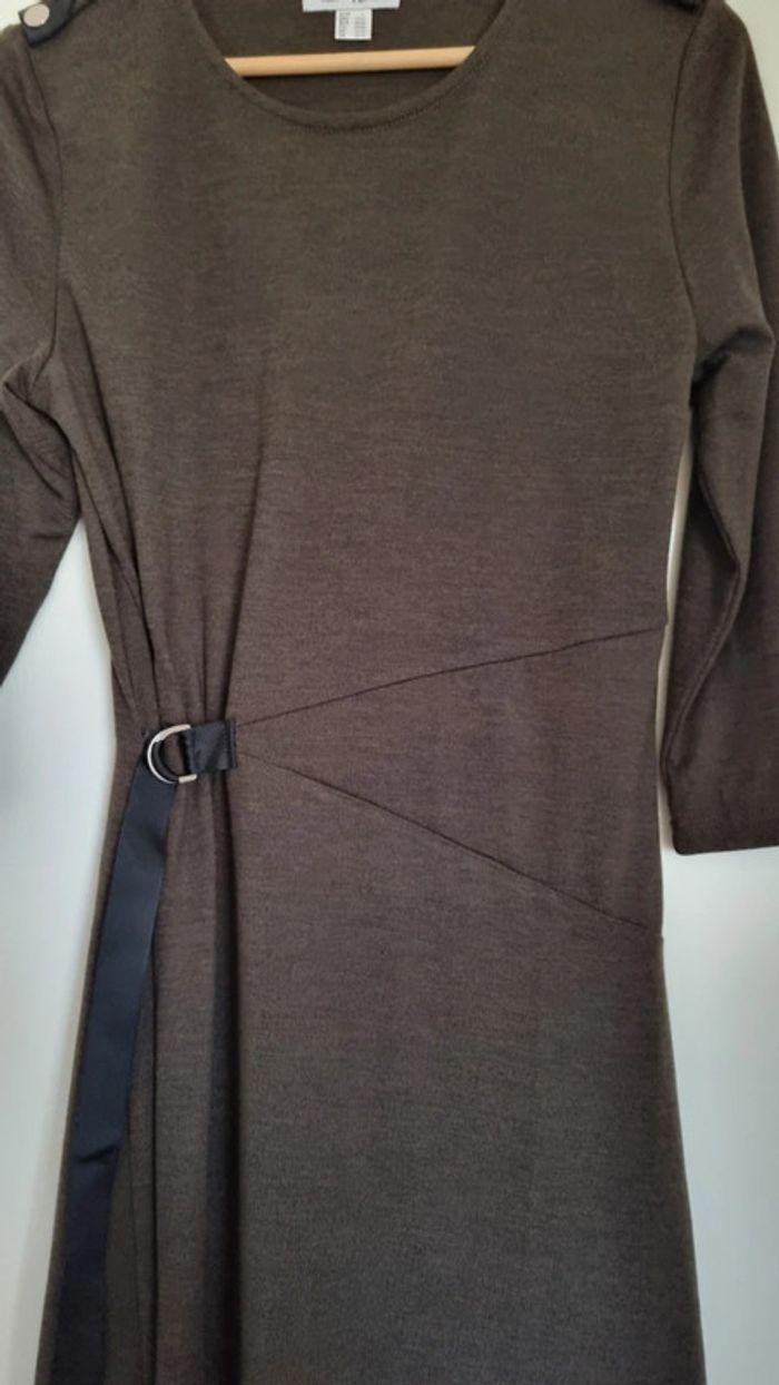 Robe en maille vert kaki col rond, ceinture à nouer autour de la taille, boutons chromés cousus sur les épaules Taille L Matière : 95%polyester et 5% elasthanne Longueur de la robe : 91 cm Jamais portée