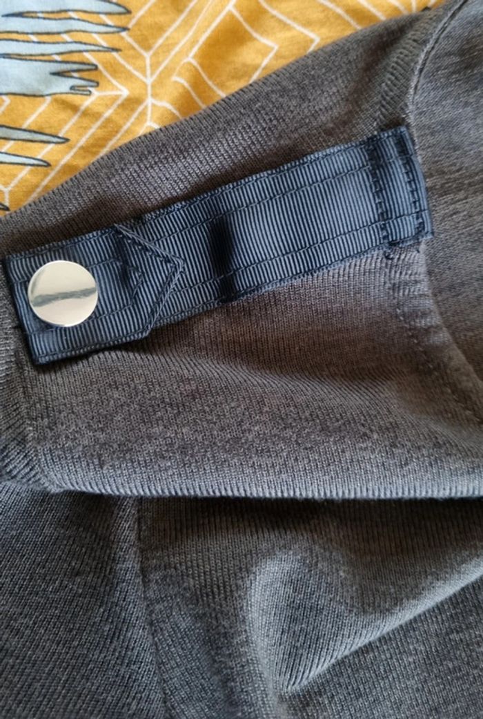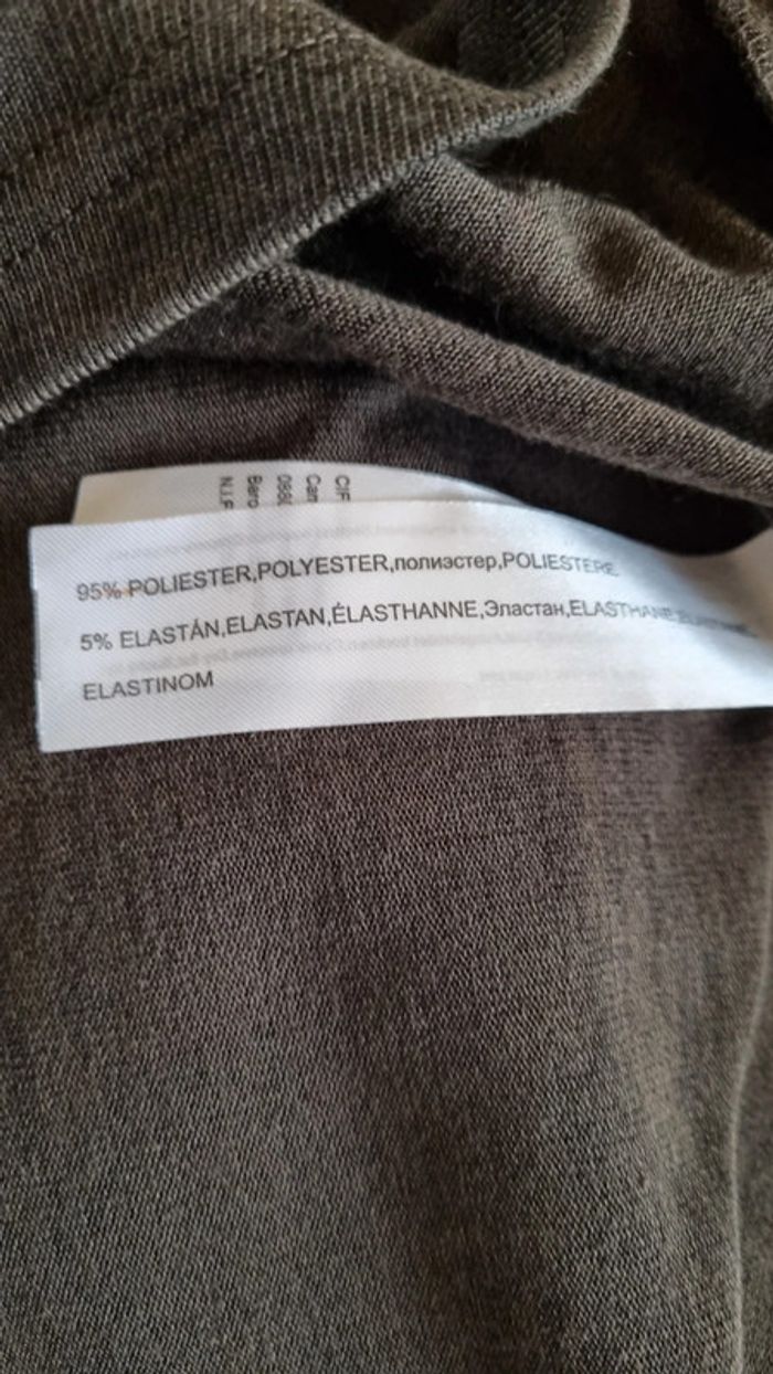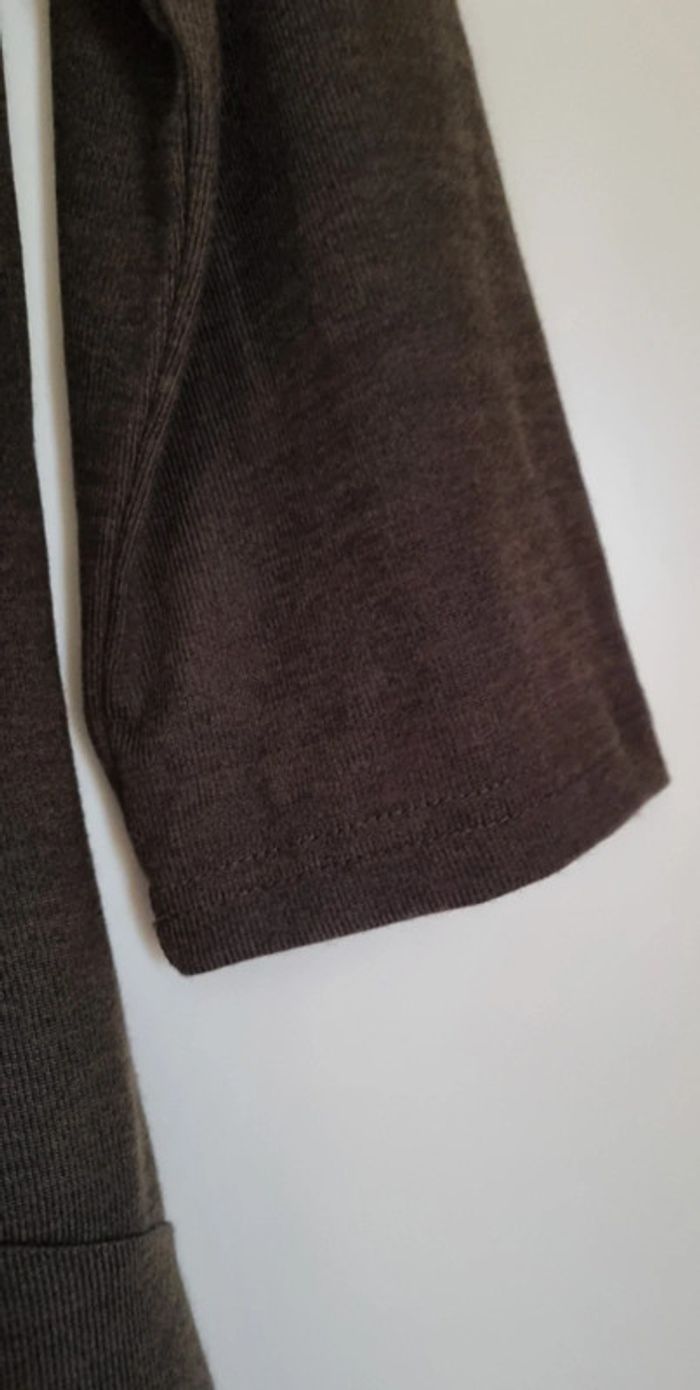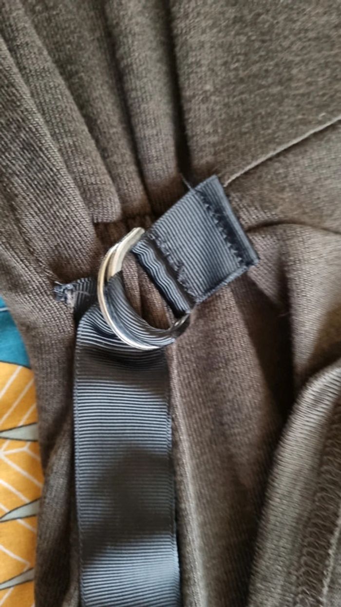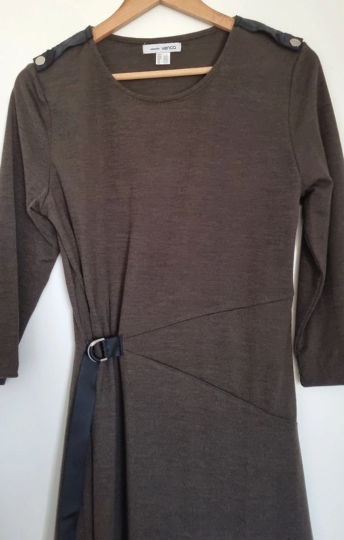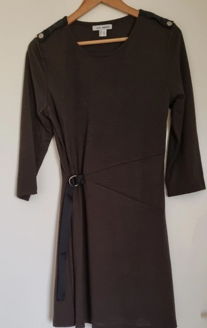 Robe en maille vert kaki col rond, ceinture à nouer autour de la taille, boutons chromés cousus sur les épaules Taille L Matière : 95%polyester et 5% elasthanne Longueur de la robe : 91 cm Jamais portée