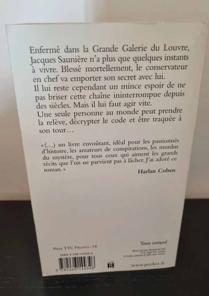 Da Vinci Code Livre de poche comme neuf 745 pages Année 2006 Enfermé dans la Grande Galerie du Louvre, Jacques Saunière n'a plus que quelques instants à vivre. Blessé mortellement, le conservateur en chef va emporter son secret avec lui. Il lui reste cependant un mince espoir de ne pas briser cette chaîne ininterrompue depuis des siècles. Mais il lui faut agir vite. Une seule personne au monde peut prendre la relève, décrypter le code et être traquée à son tour...