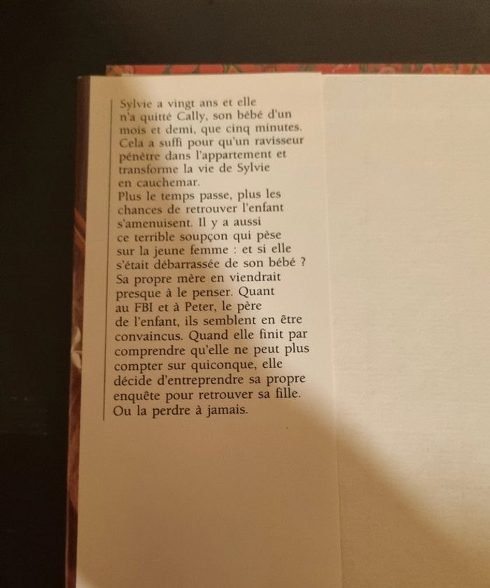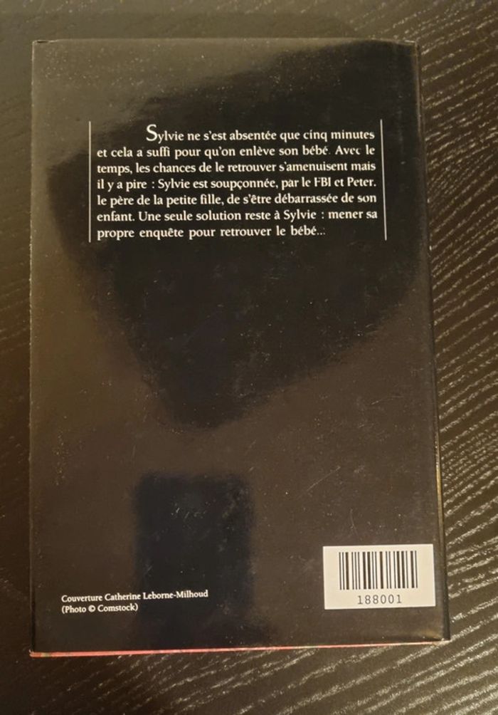 Roman de 329 pages Livre neuf Résumé : Sylvie ne s'est absentée que cinq minutes et cela a suffit pour qon enlève son bébé. Avec le temps, les chances de le retrouver s'amenuisent mais il y a pire : Sylvie est soupçonnée, par le FBI et Peter le père de la petite fille de s'être débarrassée de son enfant. Une seule solution reste à Sylvie : mener sa propre enquête pour retrouver le bébé.