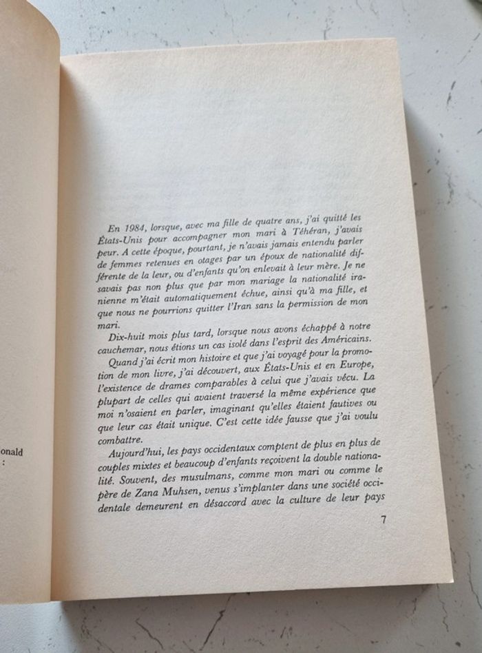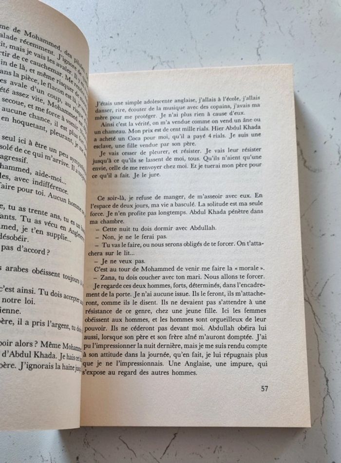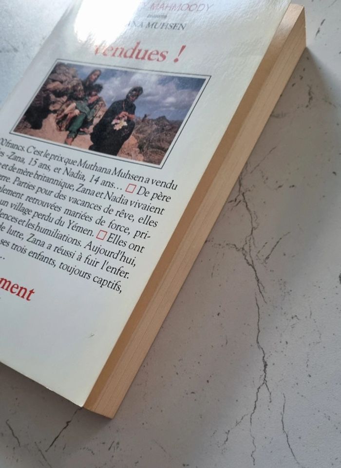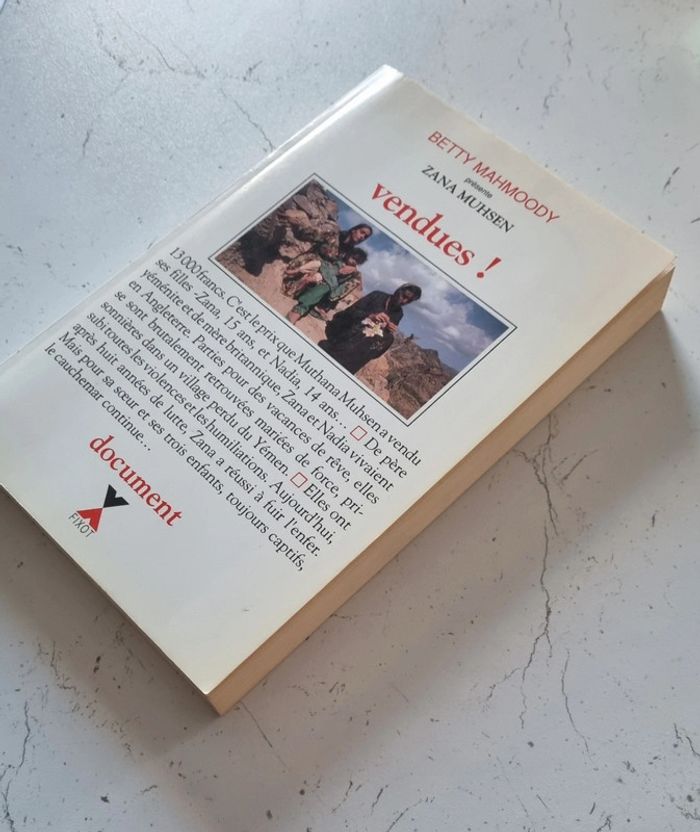 Année 1993 309 pages 13 000 F. C'est le prix auquel Muthana Muhsen a vendu ses filles : Zana 15 ans, et Nadia, 14 ans... De père yéménite et de mère britannique, zana et Nadia vivaient en Angleterre. Parties pour des vacances de rêve,elles se sont brutalement retrouvées mariées de force, prisonnières dans un village perdu des hauts plateaux du Yémen. Elles ont subi toutes les violences et les humiliations, soumises à des rites de vie moyennageux, insultées, trimant comme des esclaves, battues par leur beau-père... Aujourd'hui, après huit années de lutte, Zana a réussi  à fuir l'enfer et à regagner l'Angleterre. Mais pour sa soeur et leurs enfants, toujours captifs, le cauchemar continue. Zana, elle, a entrepris de se battre pour traîner en justice ce père indigne et faire libérer les siens... Livre comme neuf, à part la page de couverture qui a jauni