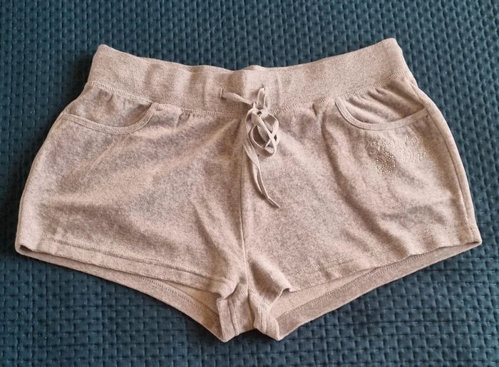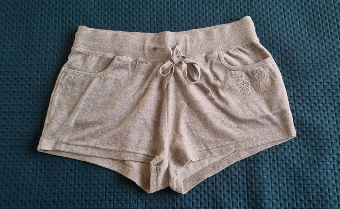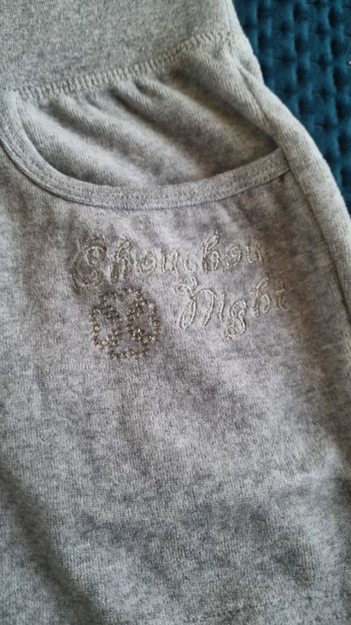 Short gris chiné 2 poches avant dont 1 avec strass brodé avec inscription Choucou Night Taille élastique large de 5 cm , avec cordon d'attache Taille: 38/40 Matière : 80% coton et 20% polyester Très bon état
