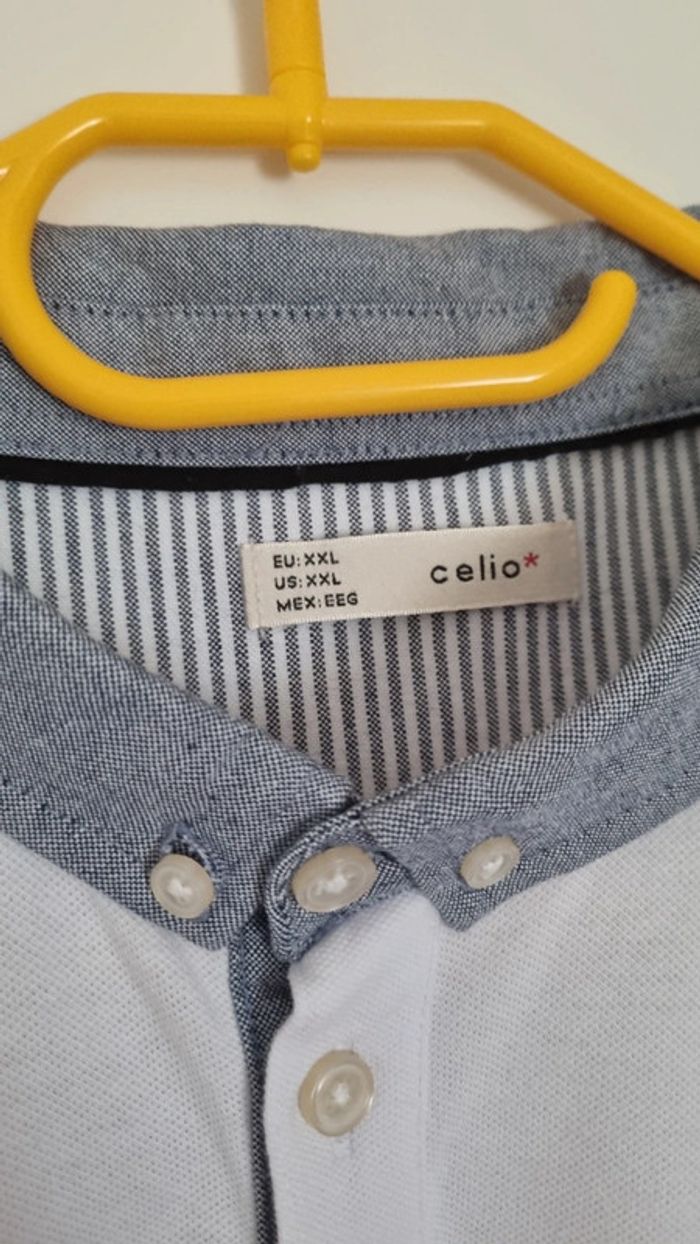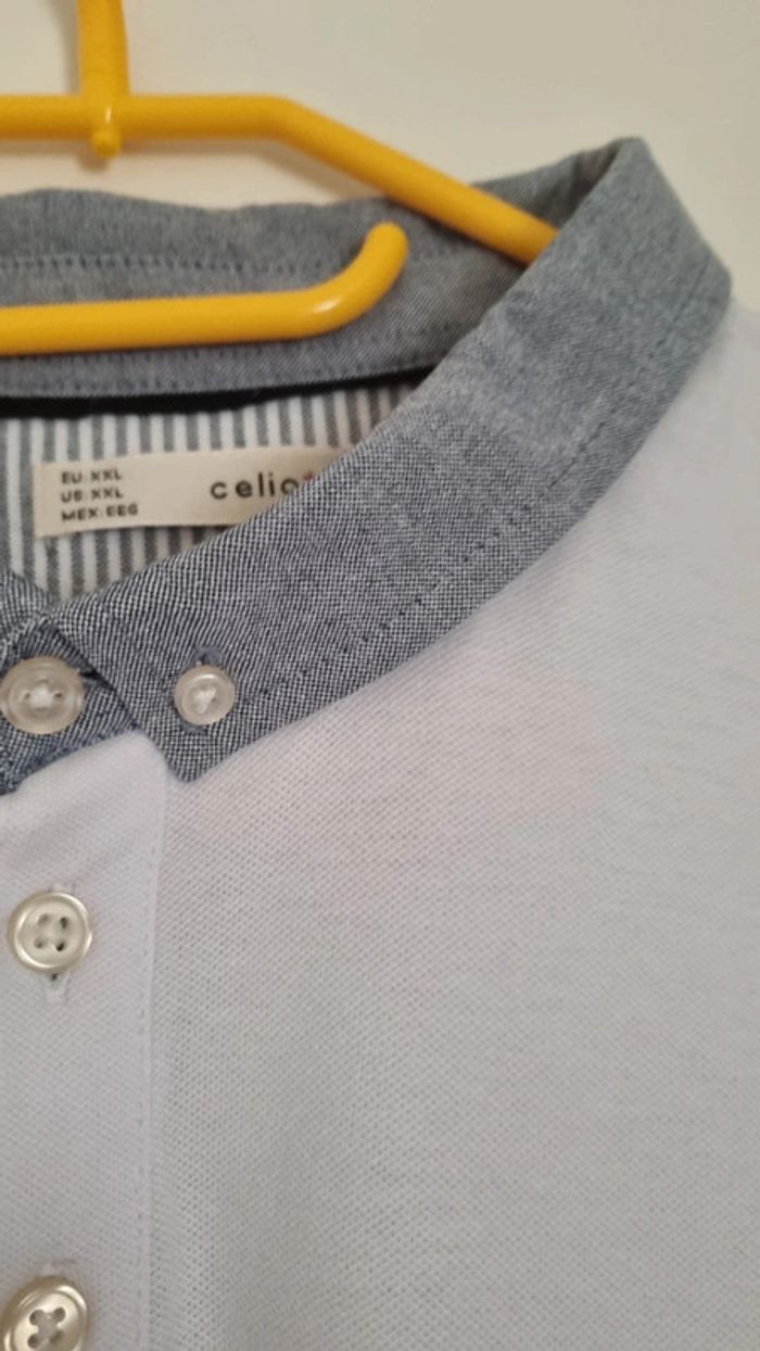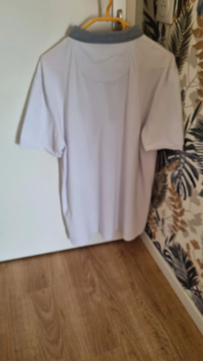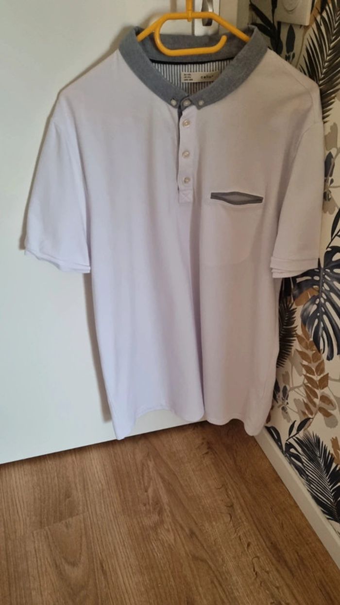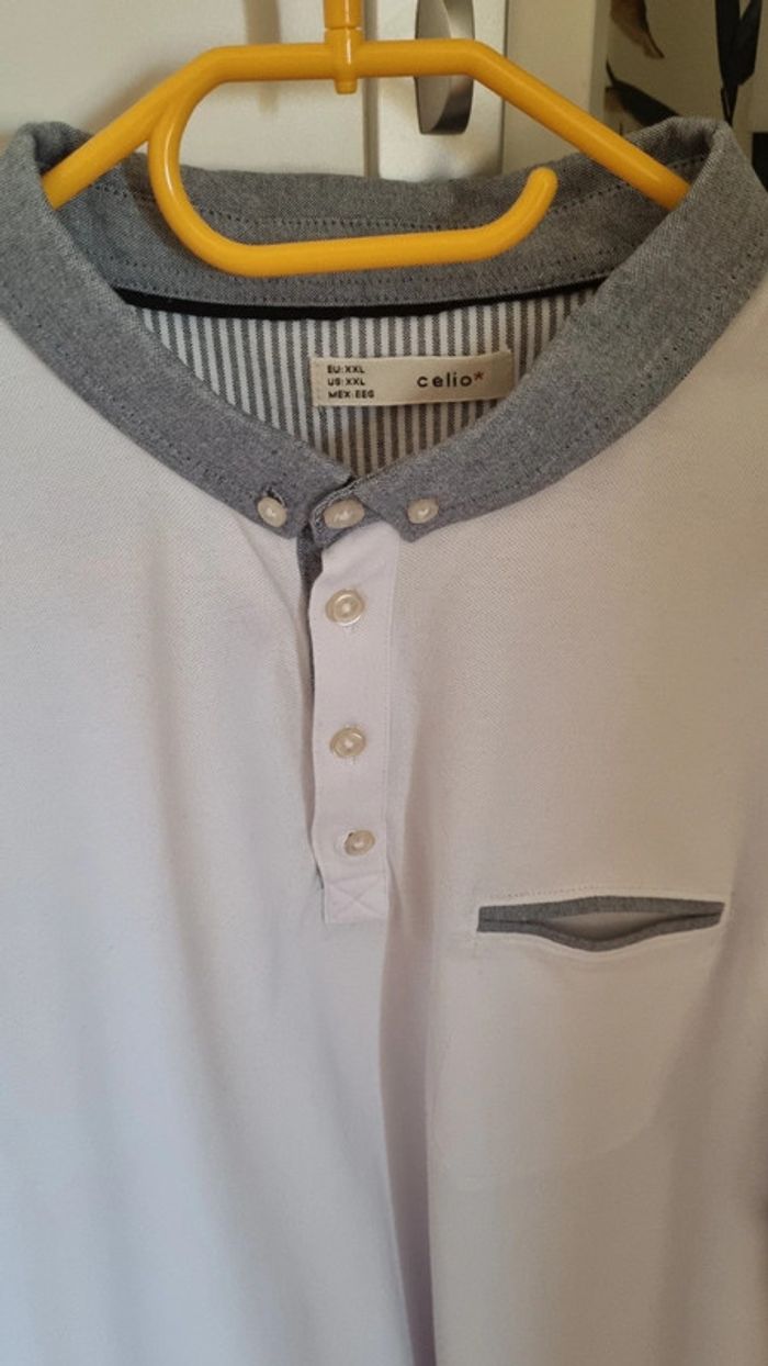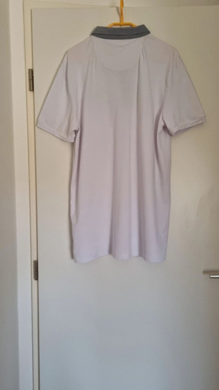 Polo blanc manches courtes Col gris Longueur polo: 85 cm Largeur aisselles à aisselles : 57 cm cmtaimle: 2XL 100% coton Neuf, jamais porté