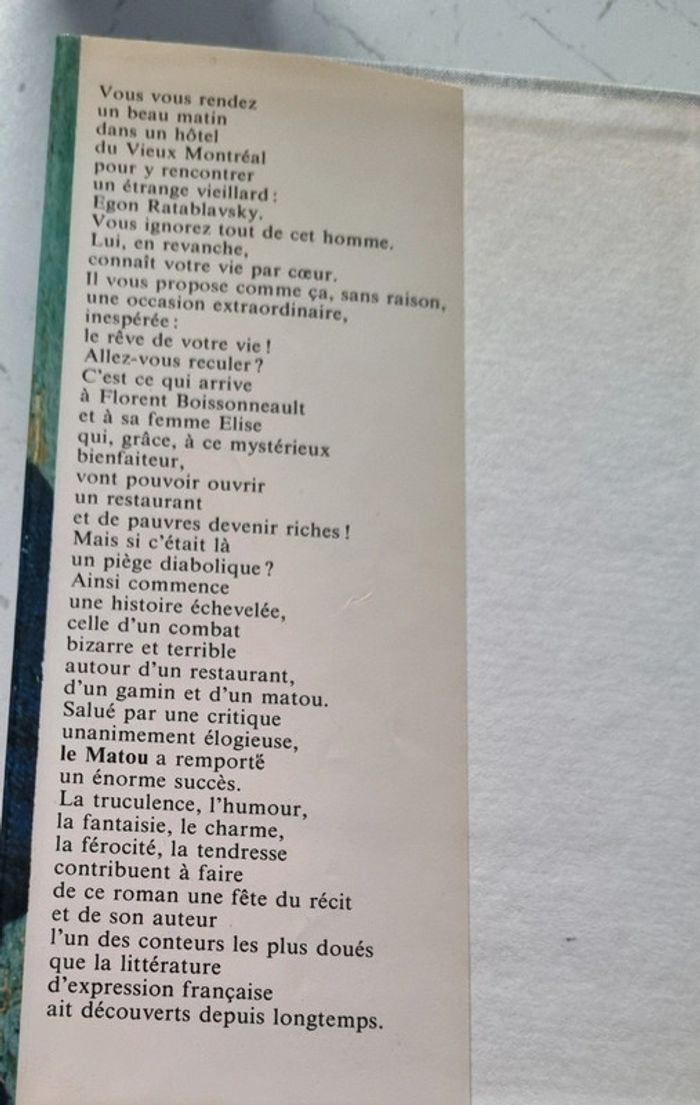 Livre de 602 pages Comme neuf Résumé: Le Matou raconte l'histoire rocambolesque et ubuesque de Florent, un jeune homme ambitieux qui fait la rencontre de son Méphistophélès en la personne d'un riche vieillard, Egon Ratablavasky, qui lui permettra d'acquérir l'objet de sa convoitise, La Binerie Mont-Royal.