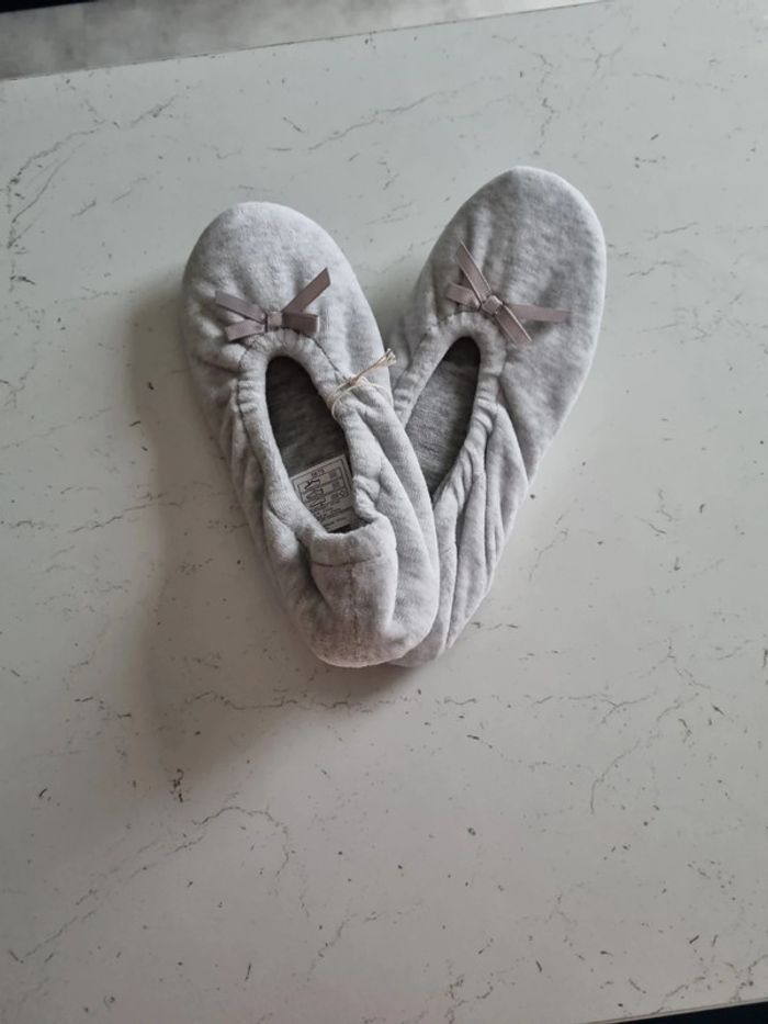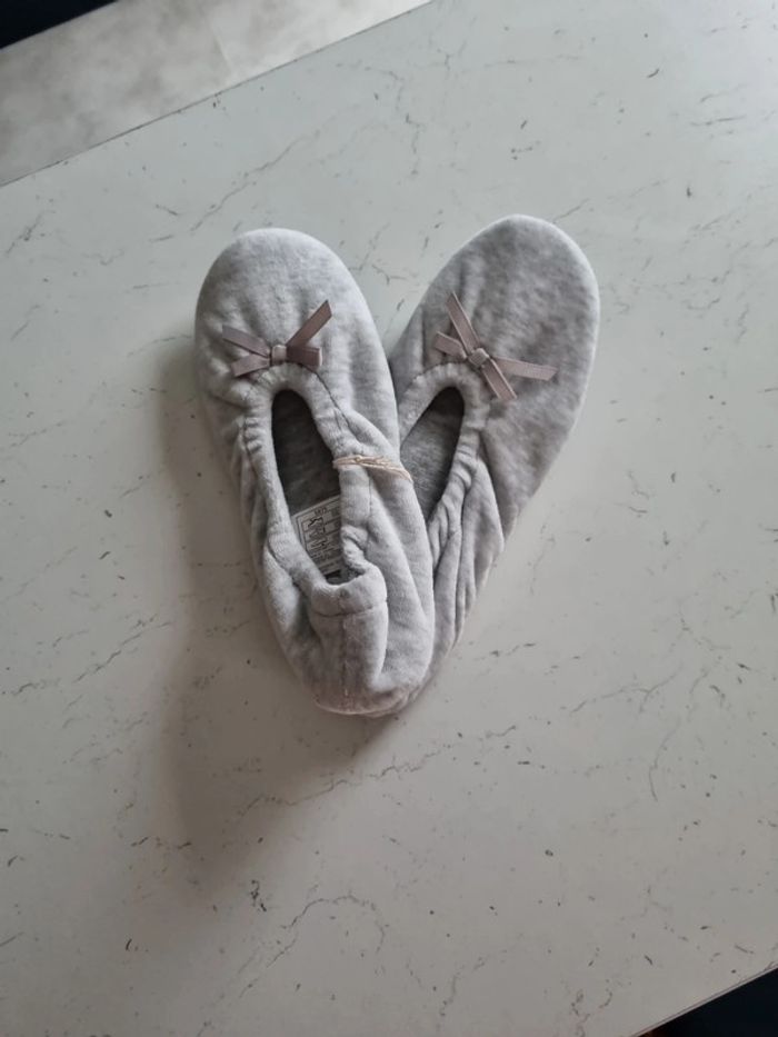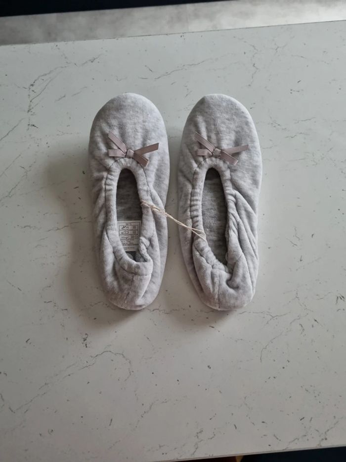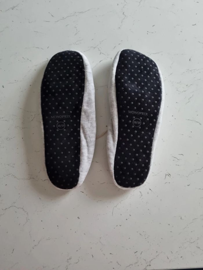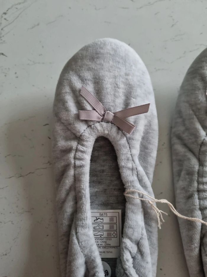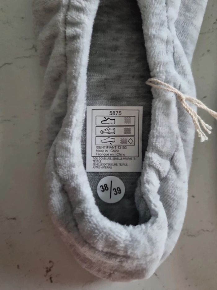 Chaussons en velours gris Noeud ton sur ton cousu au dessus Finition élastiquée Intérieur en maille éponge Semelle souple Dessous antidérapant MATIERE PRINCIPALE : 100% POLYESTER SEMELLE EXTERIEURE : 100% CAOUTCHOUC Neufs, jamais portés Taille : 38/39 Neufs, jamais portés