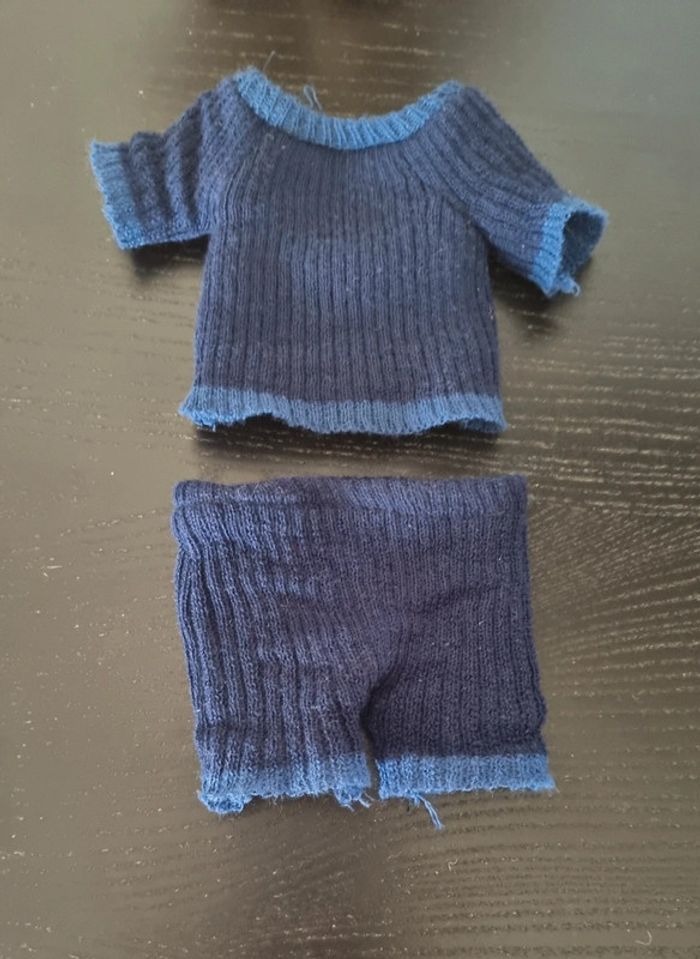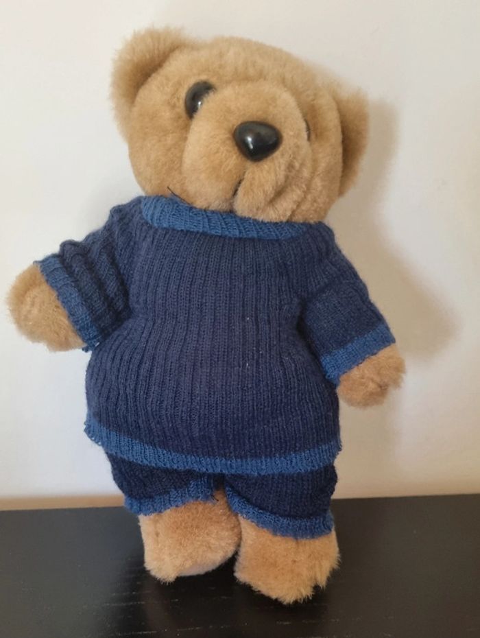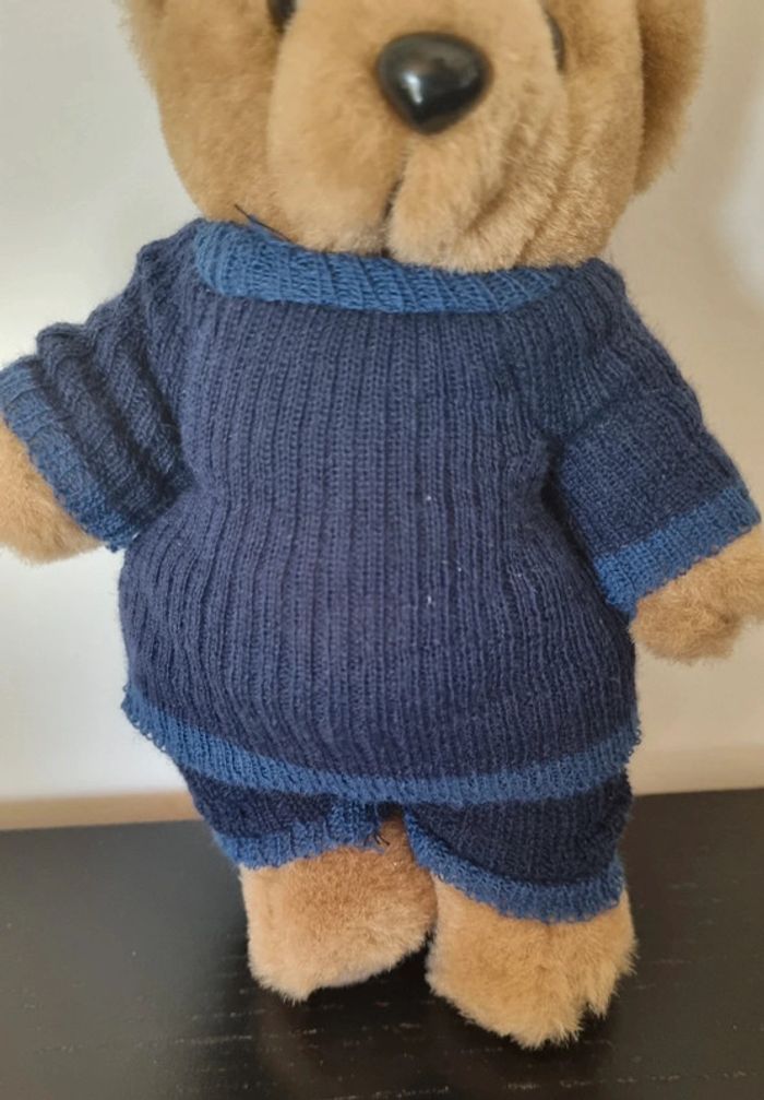 Petit ours brun habillé avec ensemble bleu marine en maille ( 1 pantalon et et tee-shirt) On peut lui enlever ses vêtements Dimensions : 20 cm