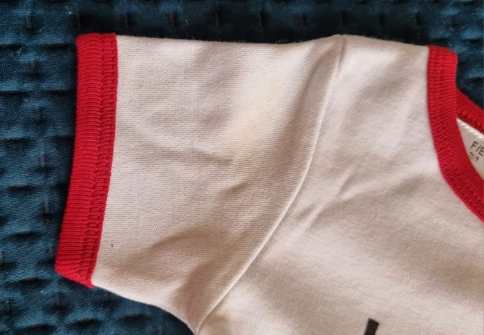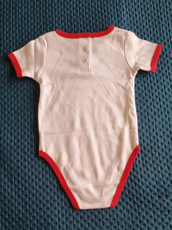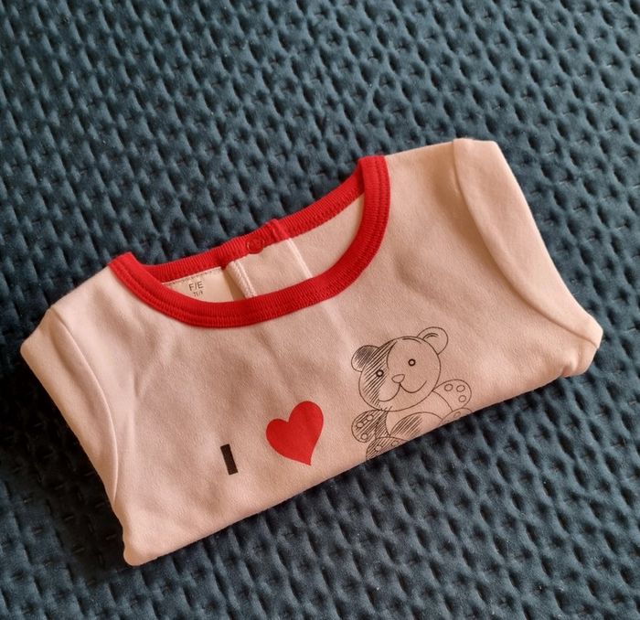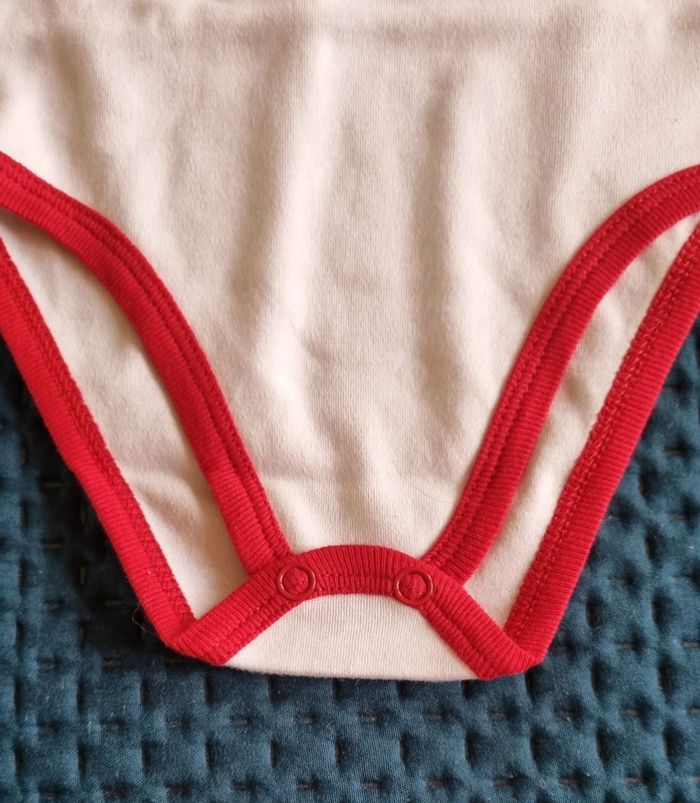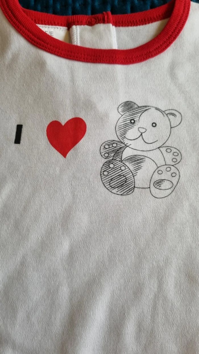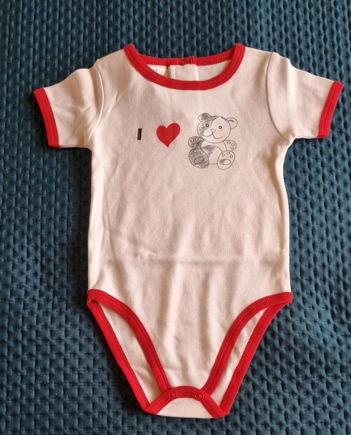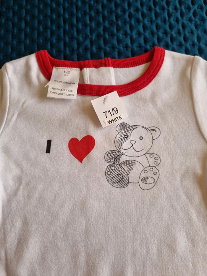 Body blanc 100 % coton bordures rouges Manches courtes avec écriture en noir j'aime les ours bouton pression au dos et entrejambes Petite tache jaunie par le temps ( bonne neuf, non lavé ) Fille ou garçon taille 71/9 100% coton Neuf
