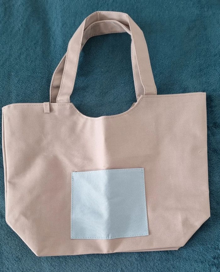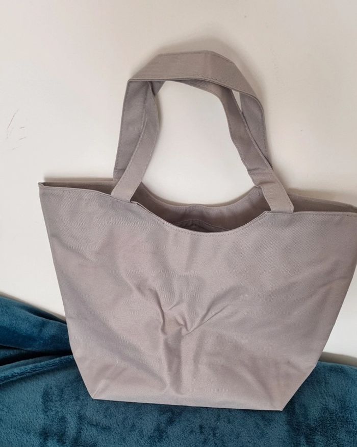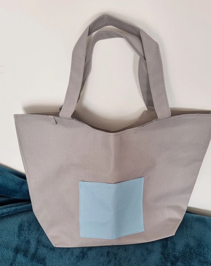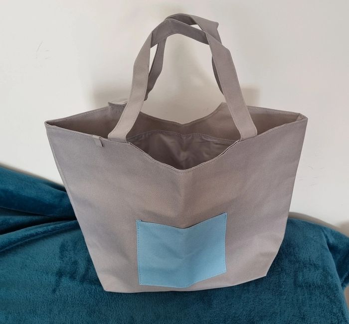 Sac cabas gris avec poche avant bleue Dimensions : 37X27 cm Hauteur des anses: 9 cm Matière lavable Neuf dans son emballage d'origine