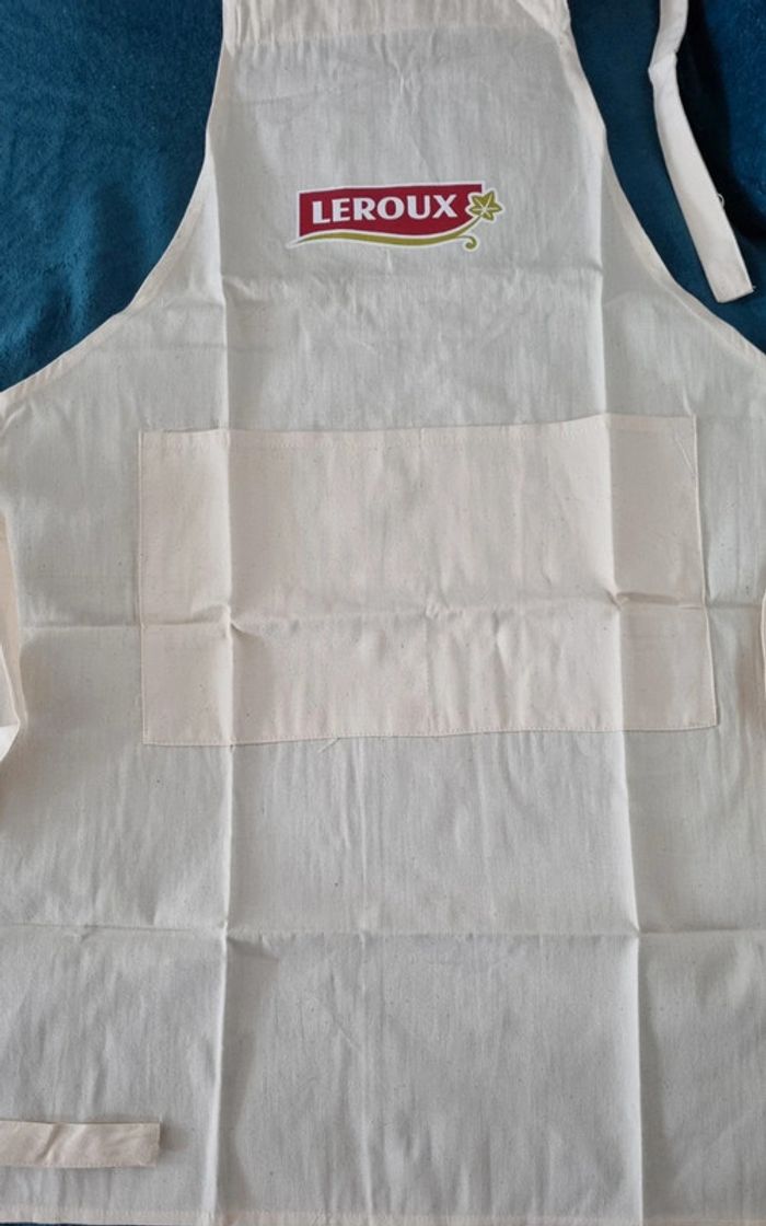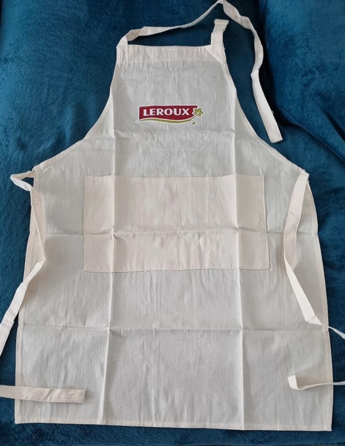 Tablier écru Leroux en coton Attache derrière le cou et la taille 100% coton 1 grande poche devant 84X58 cm Dimensions : Neuf dans son emballage d'origine