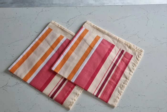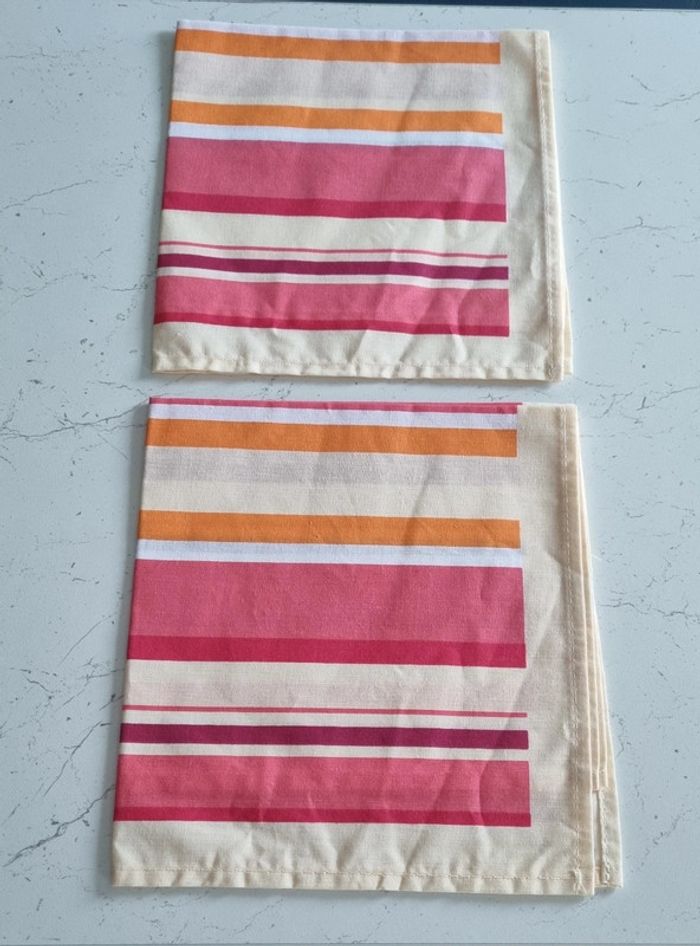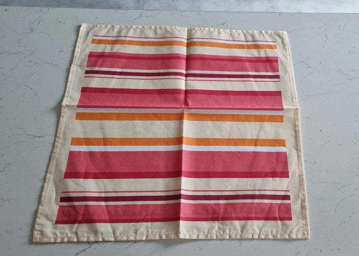 Lot de 2 serviettes de table multicolore à rayures Forme carrée 50% coton et 50% polyester Dimensions : 42X42 cm Neuf dans son emballage d'origine