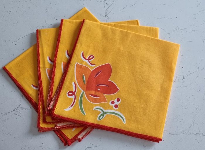 Lot de 4 serviettes de table Forme carrée couleur orange avec fleurs Surpiqure rouge 100% coton Dimensions : 40X40 cm Neuf dans son emballage d'origine