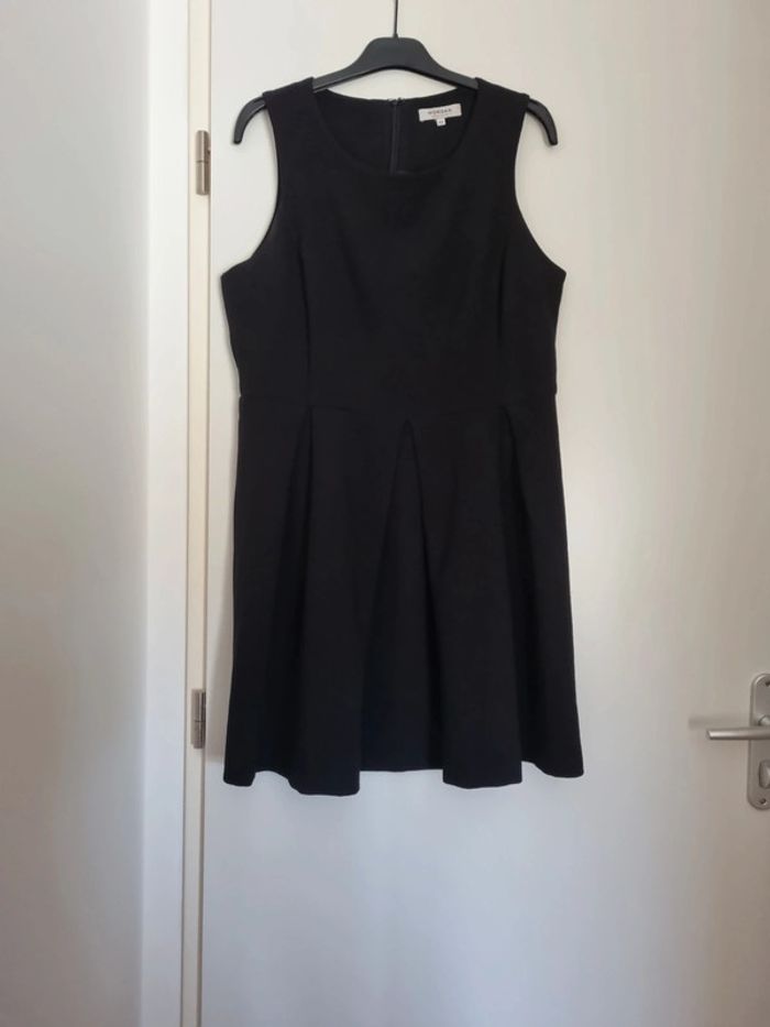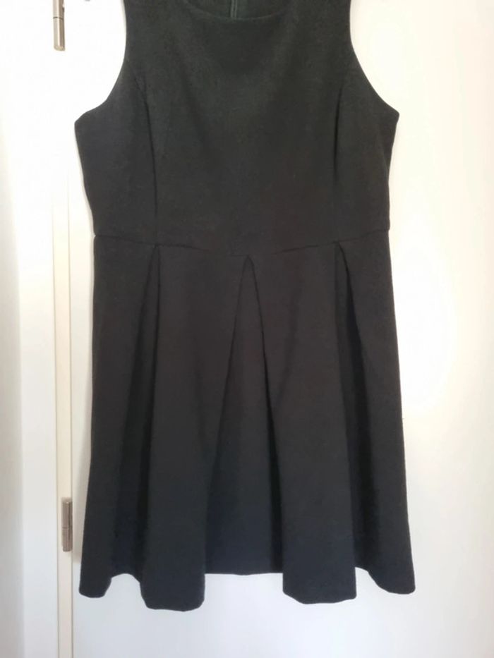 Robe noire sans manches Fermeture éclair au dos Pincée à l'avant de la robe Matière : polyester, coton et elasthanne Taille 42 Longueur robe : 92 cm Dimensions Aisselle à Aisselle : 50 cm