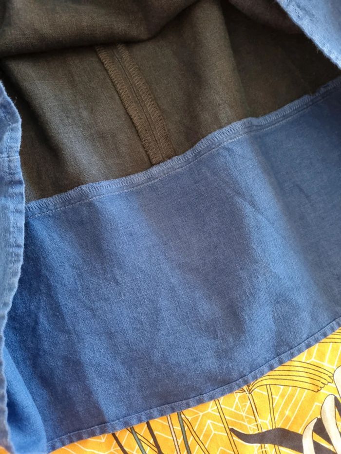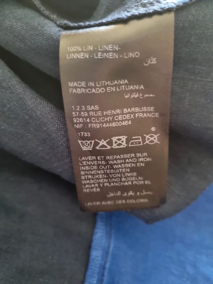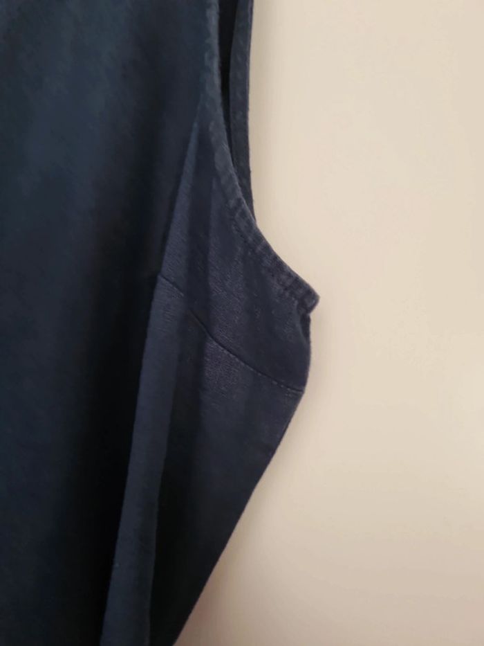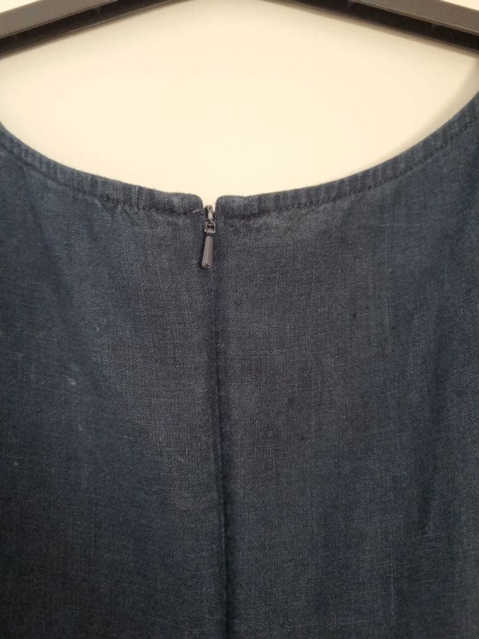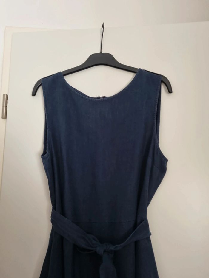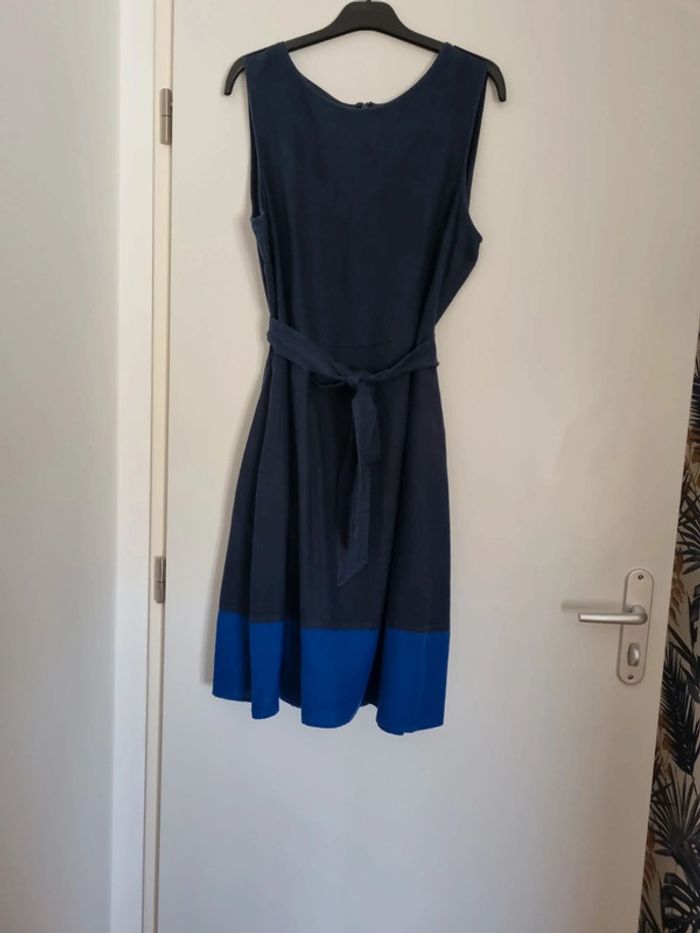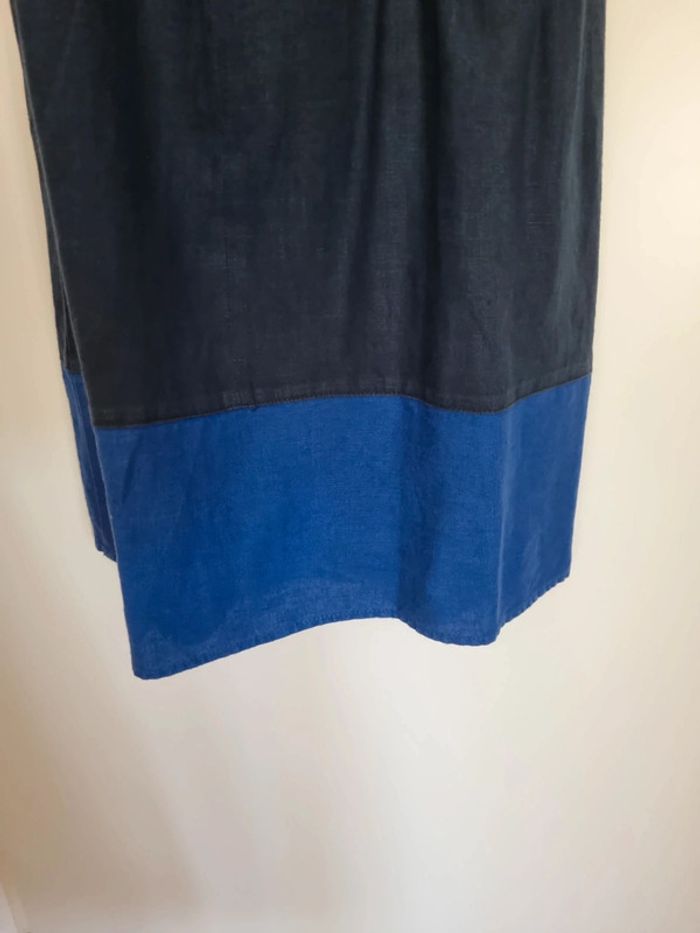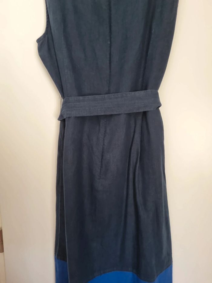 Robe bleu bicolore sans manches Avec ceinture en lin Fermeture éclair au dos Pas de doublure Taille 44 Matière : 100% lin Longueur : 102 cm Dimensions aisselle à aisselle : environ 52 cm