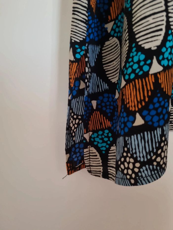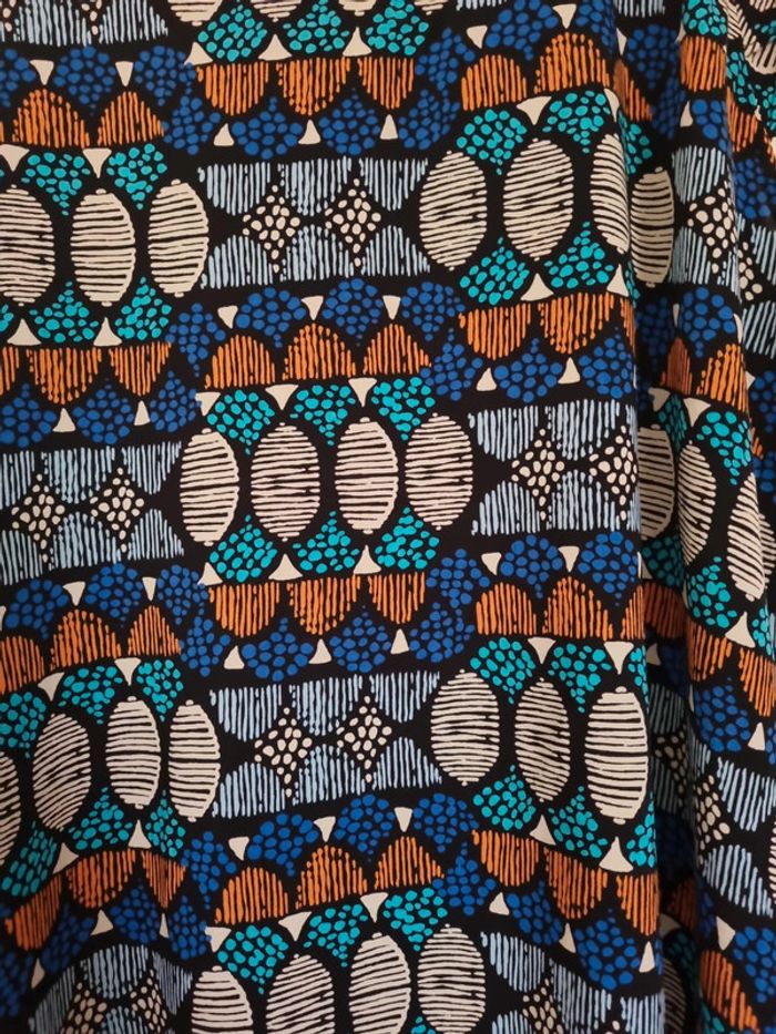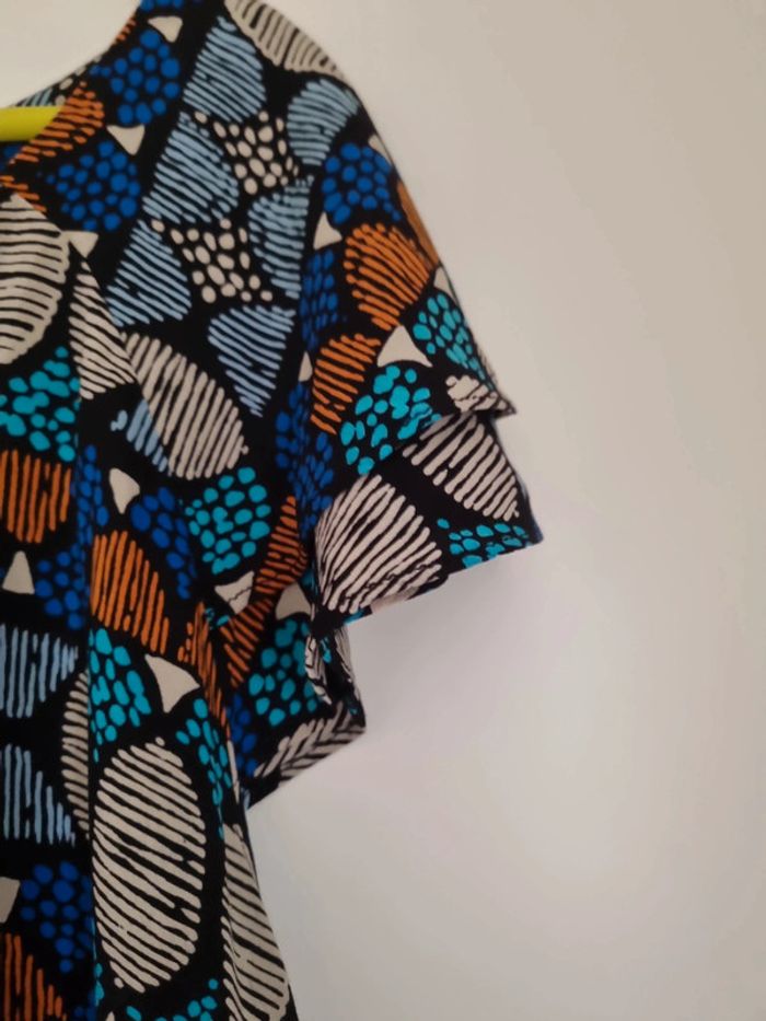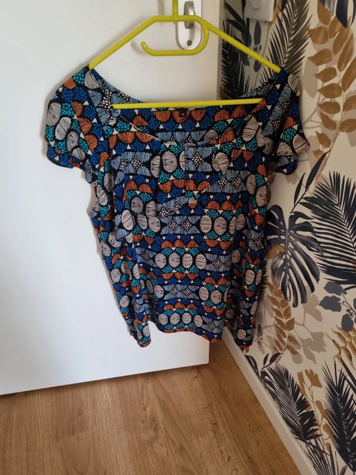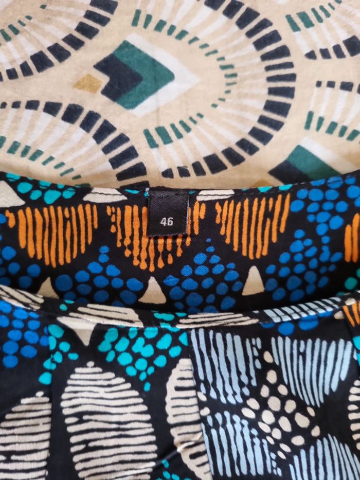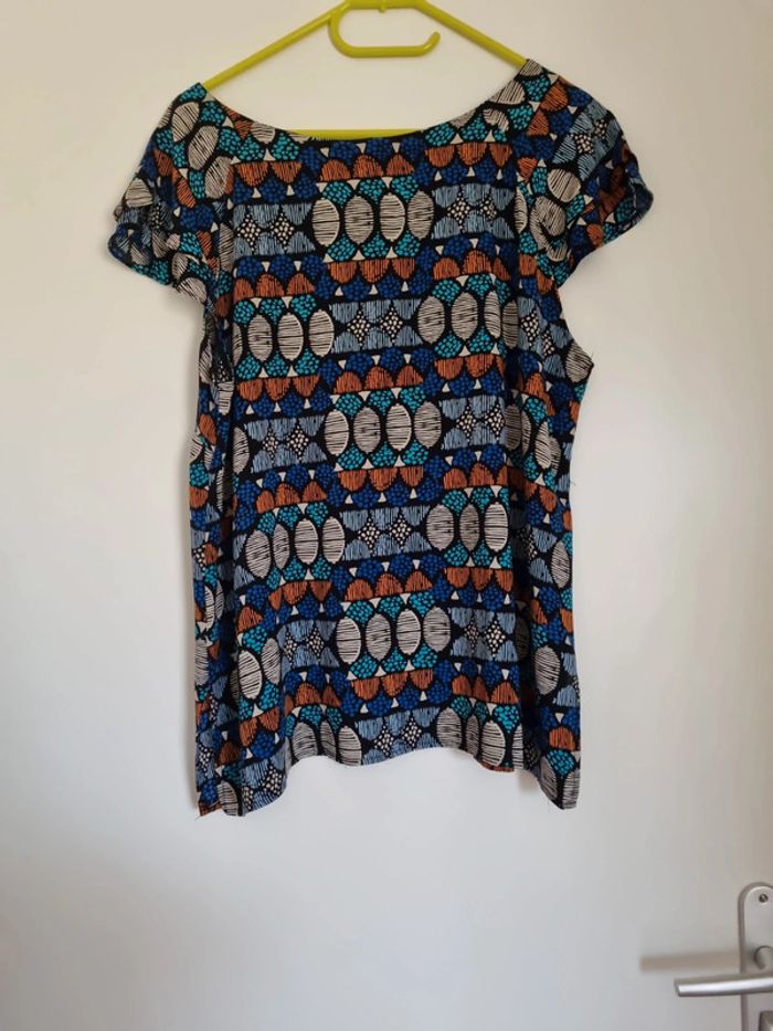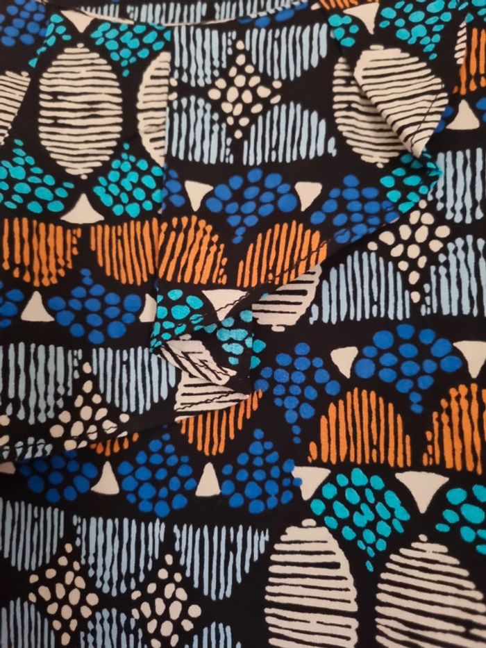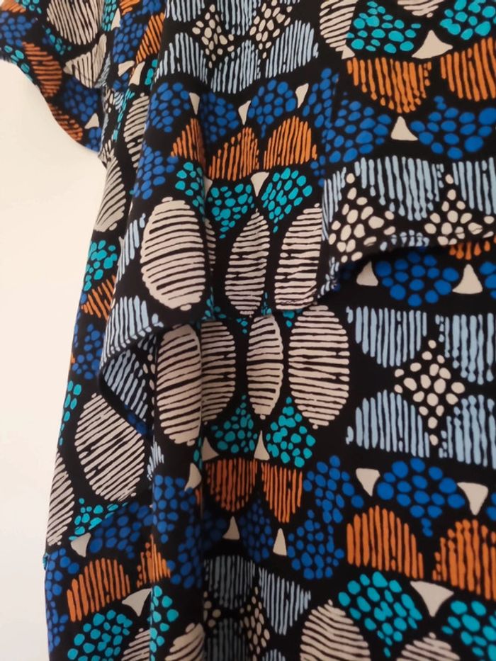 Blouse à motifs manches courtes Coloris bleu marine, bleu clair,orange, gris, noir Partie avant volantée Taille 46 Très bon état 100% viscose