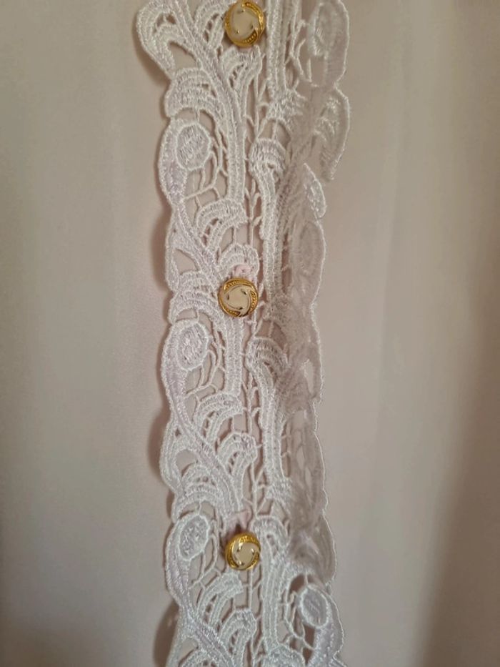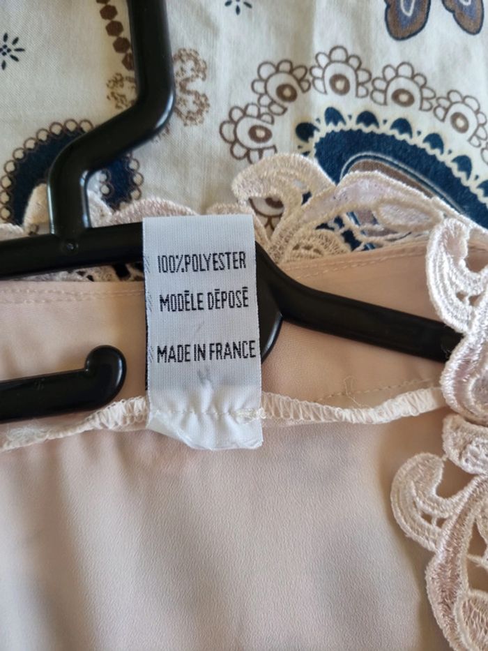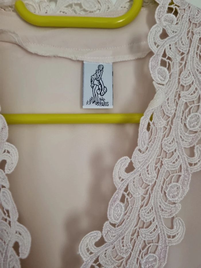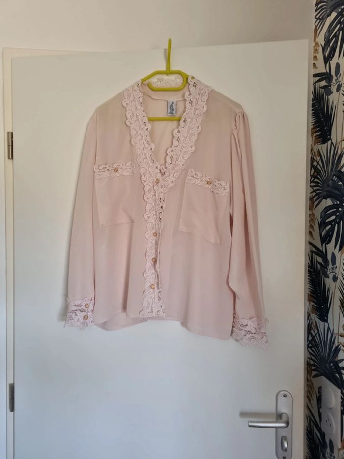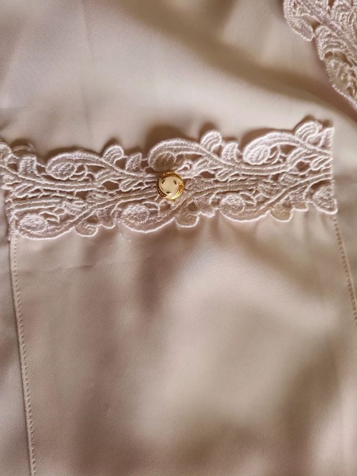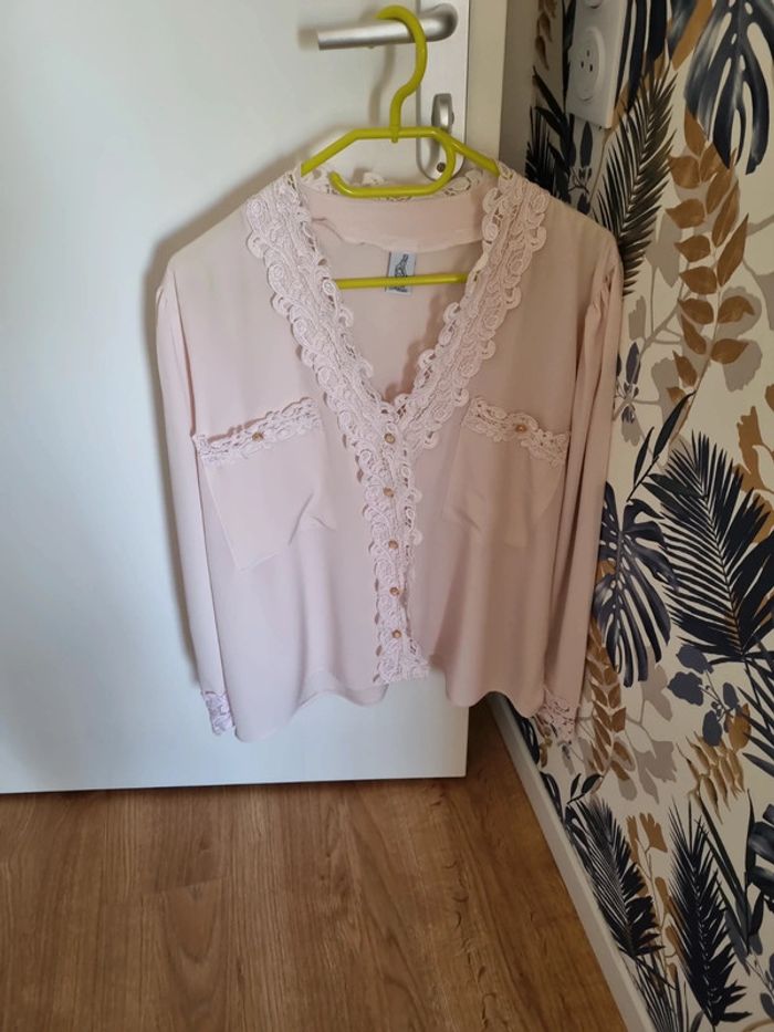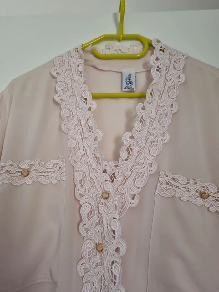 Chemisier rose poudré manches longues 2 poches avant avec dentelle rose et bouton doré Chemisier transparent Sur la partie avant boutons dorés et dentelle de haut en bas niveau du haut des manches froncées 100% polyester Taille : 46