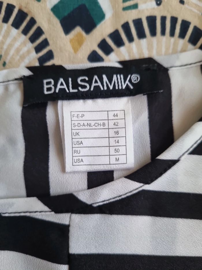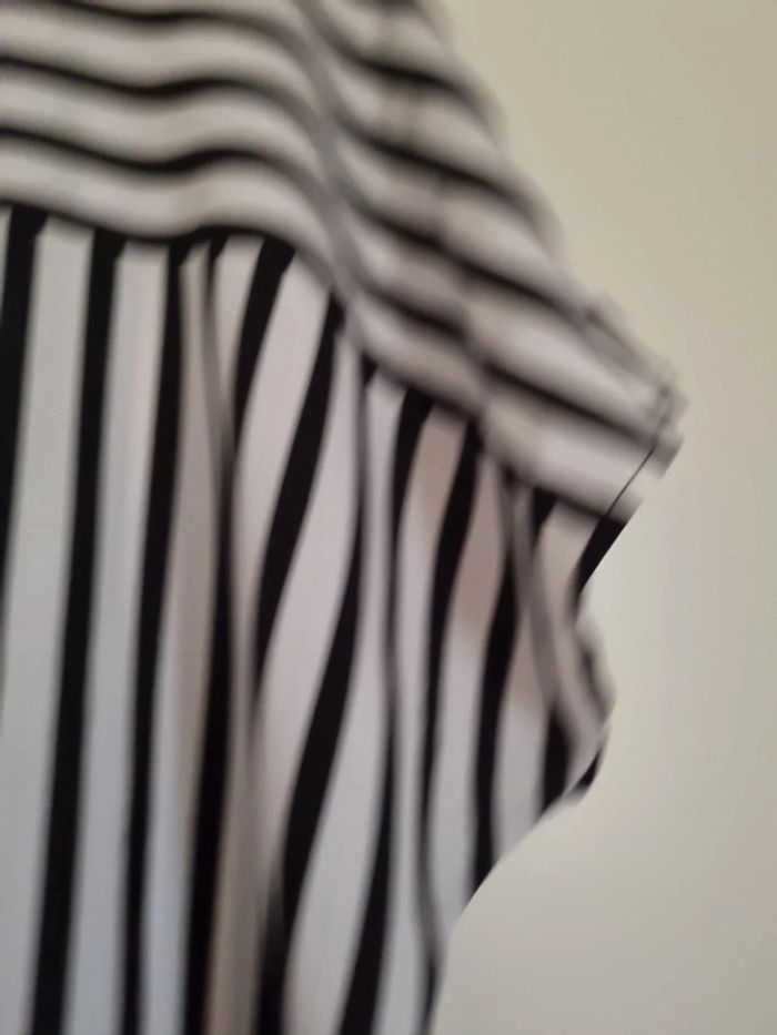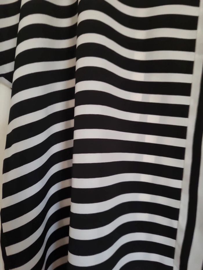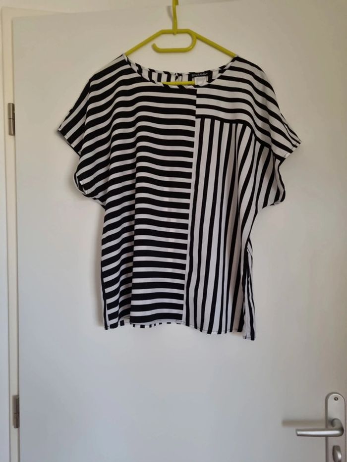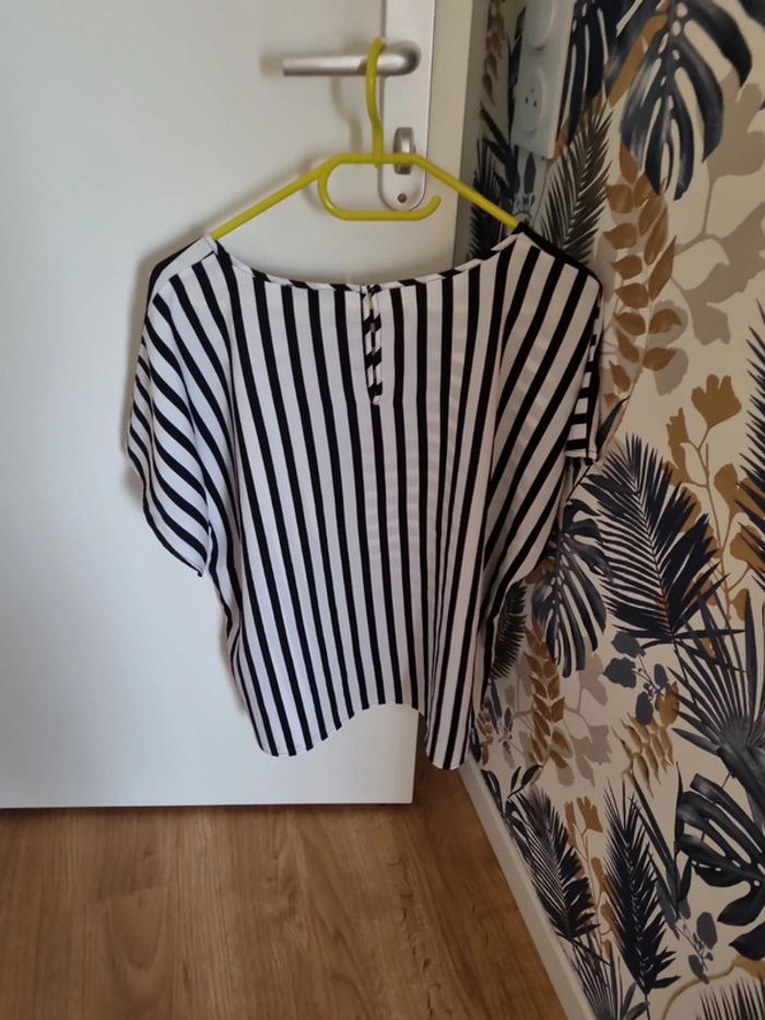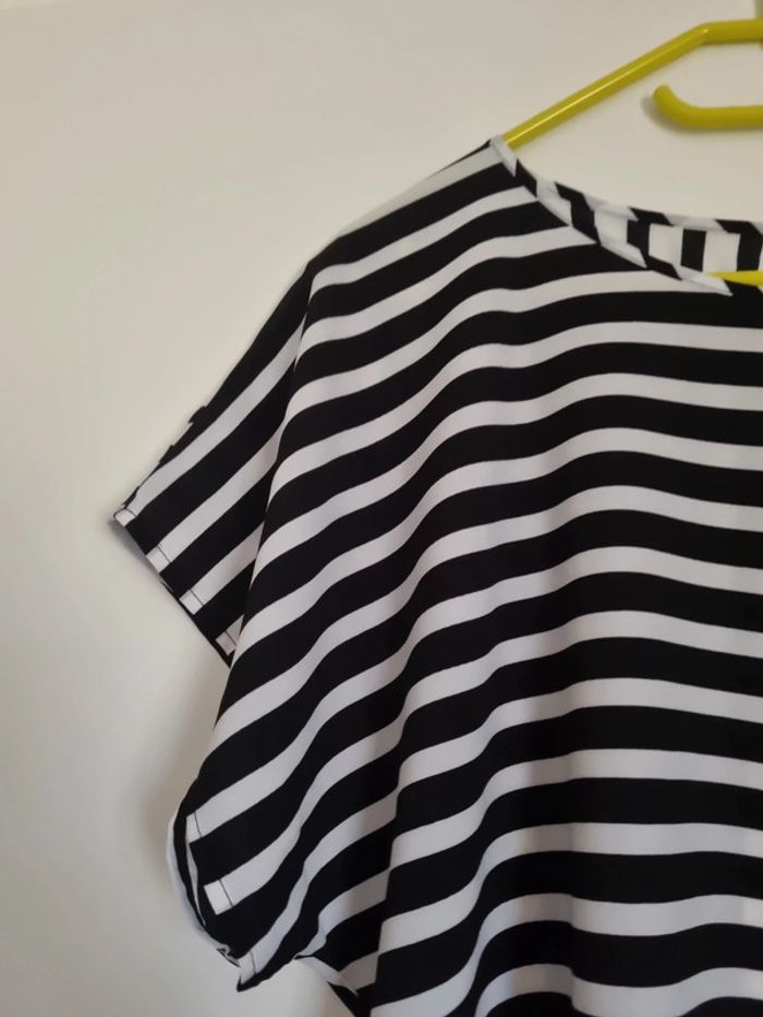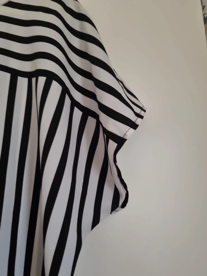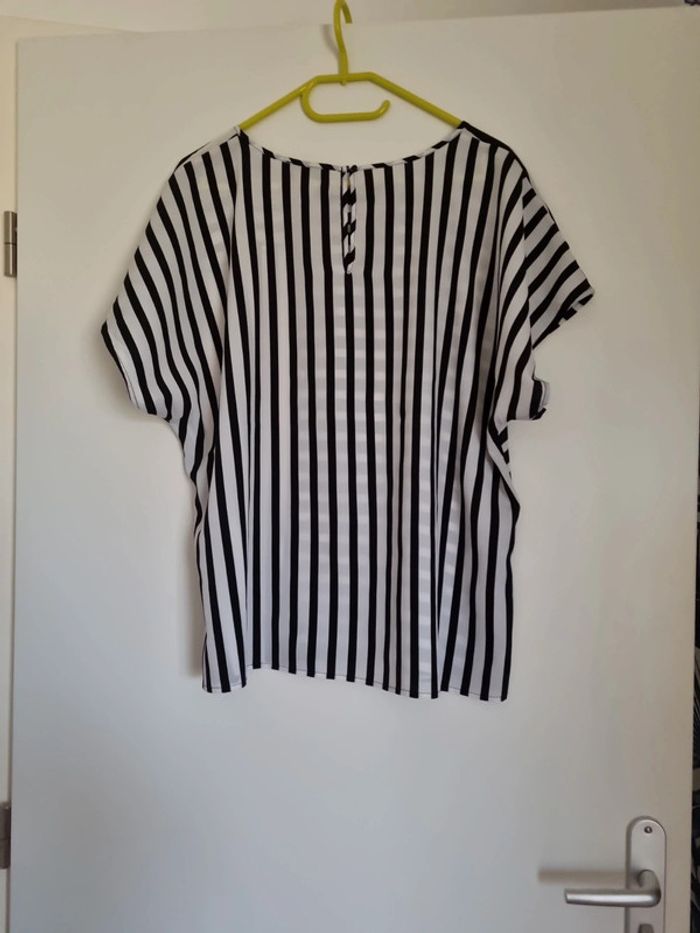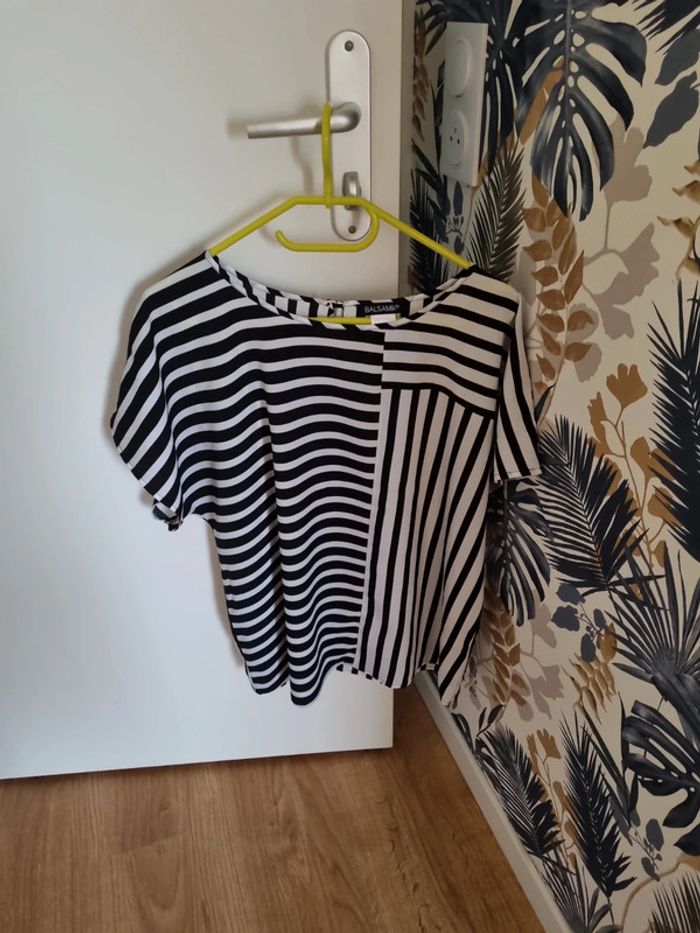 Tee-shirt à rayures blanc et bleu marine manches courtes Bouton d'attache au niveau de la nuque Taille 44 Taille large Porté 1 fois 100% polyester
