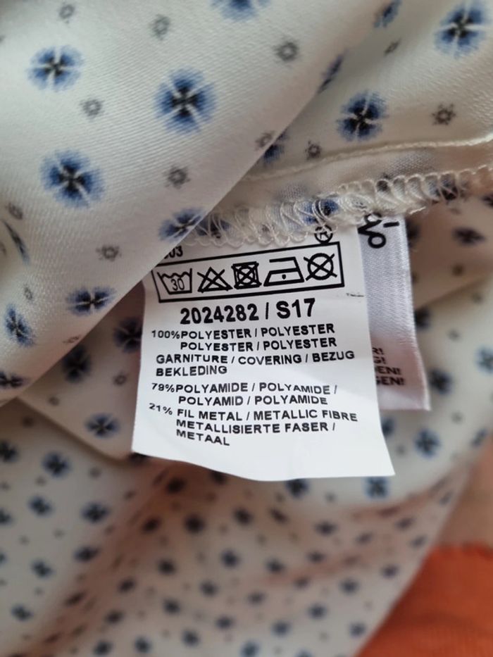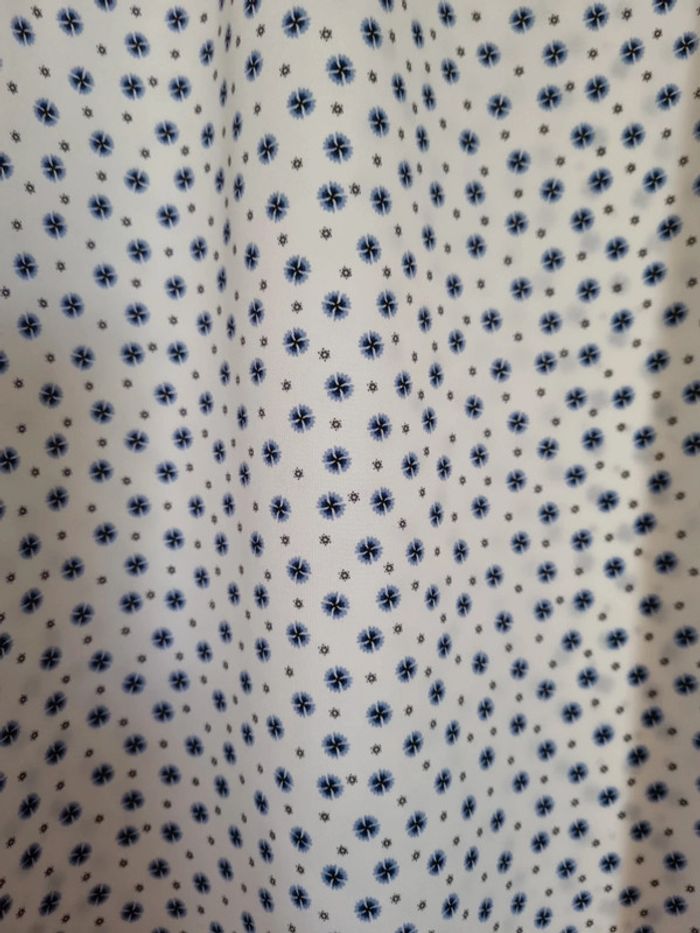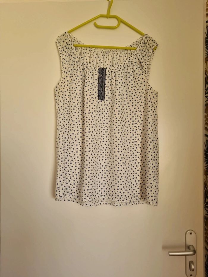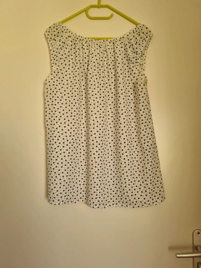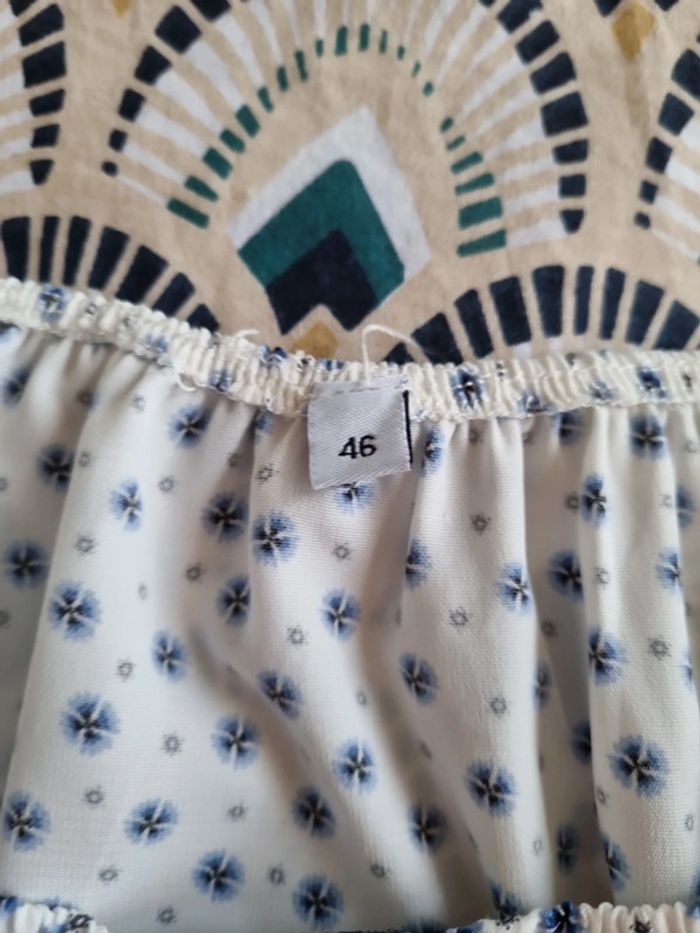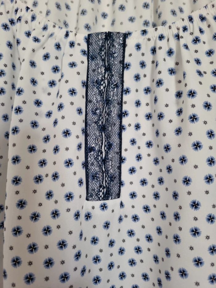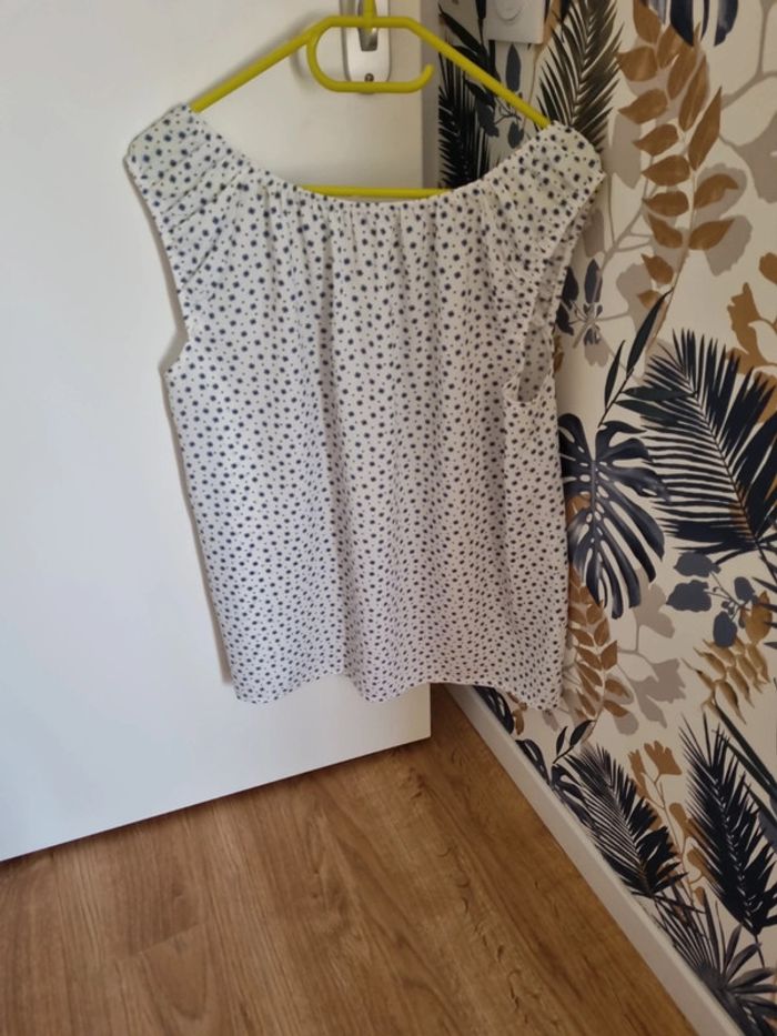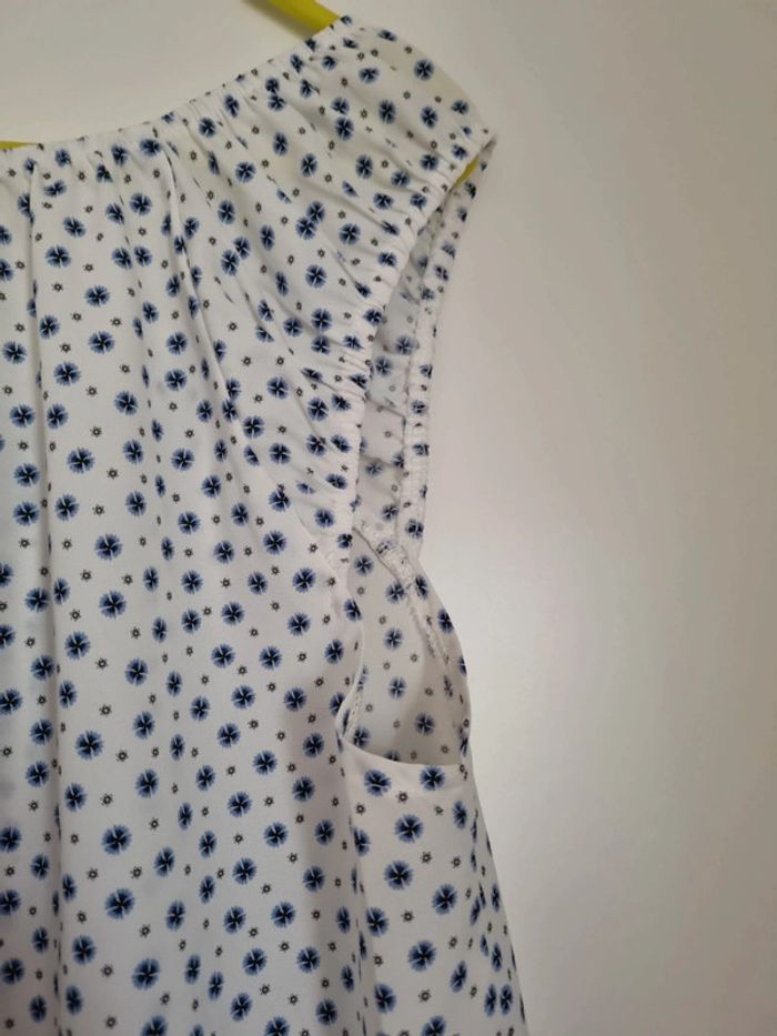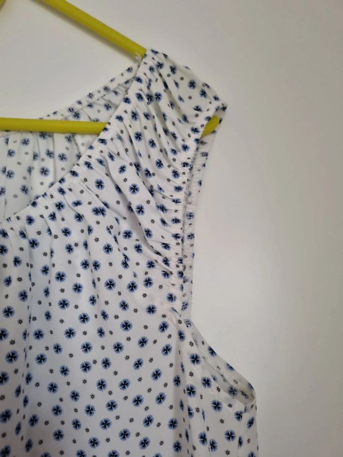 Blouse 0blanches à fleurs bleues sans manches Bretelles froncées Col rond Sur le devant petit liseret bleu et argent métallisé Peu portée Taille 46