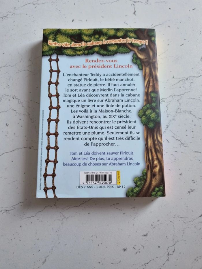 Livre La cabane magique Rendez-vous avec le président Lincoln Tome 42 Dès 7 ans 160 pages Format broché Entre vite dans la cabane à remonter le temps Résumé: Tom et Léa sont transportés à Washington, aux États-Unis, au XIXe siècle, devant la Maison-Blanche. Ils doivent rencontrer le président Abraham Lincoln qui est censé leur remettre une plume. Mais comment pénétrer dans la Maison-Blanche sans laisser-passer ? "Facile", pensent Tom et Léa car ils font par hasard la connaissance de Willy et Tad, les fils d'Abraham Lincoln. D'autant que ces derniers sont prêts à les aider ! Seulement une fois dans la maison du président, Tom et Léa constatent que le grand homme est toujours entouré par une foule de gens, et il est quasiment impossible de l'aborder. Il ne leur reste qu'une solution : boire de la potion magique en souhaitant le rencontrer quand il est seul ! C'est alors qu'ils se retrouvent en pleine campagne, et vont devoir aider un jeune garçon...