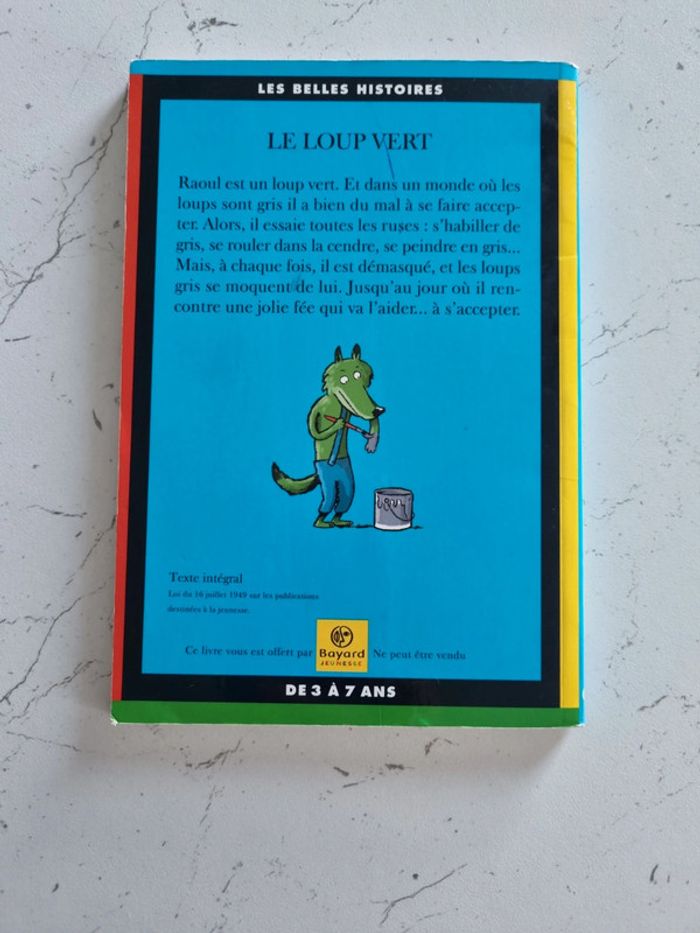 Livre Le loup vert Histoire de Raoul, le loup vert qui vit dans un monde où les loups sont gris et qui a du mal à se faire accepter. Alors il essaie toutes les ruses ... Pour les enfants de 3 à 7 ans 43 pages