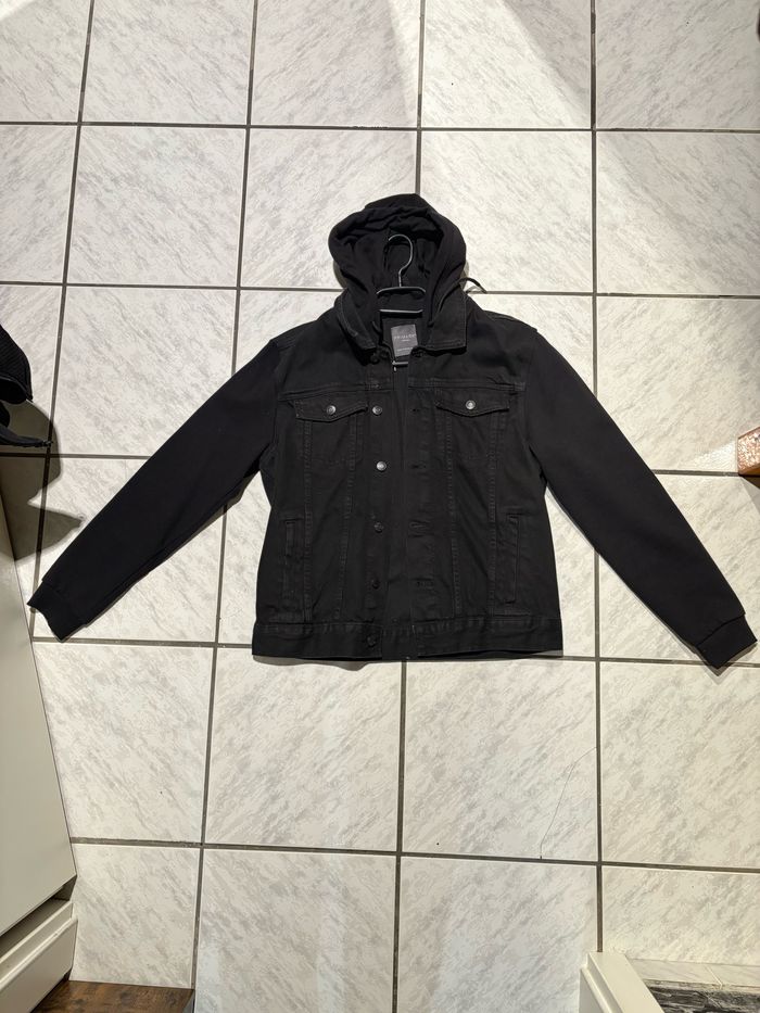 Description : Veste en jean noire avec capuche intégrée, look urbain et moderne. Idéale pour un look décontracté tout en restant stylé. Prix négociable.