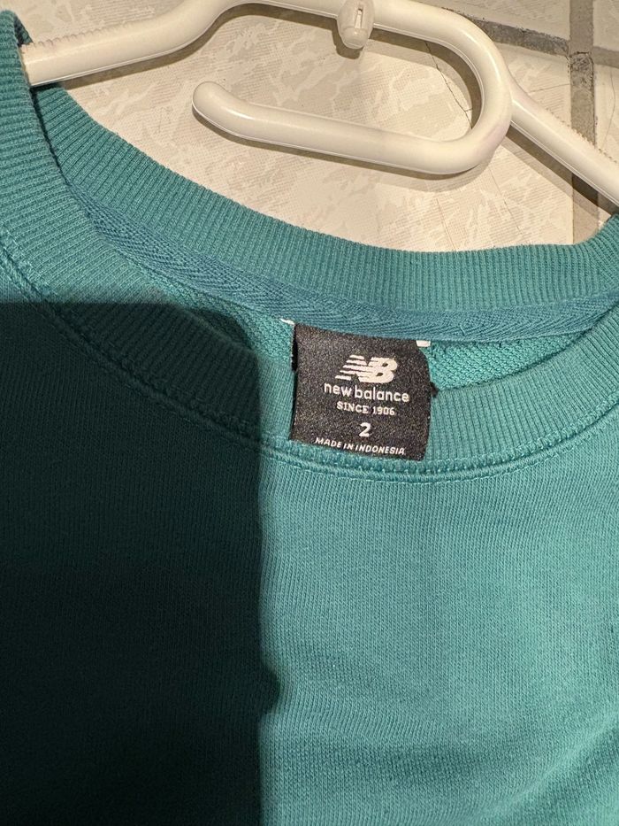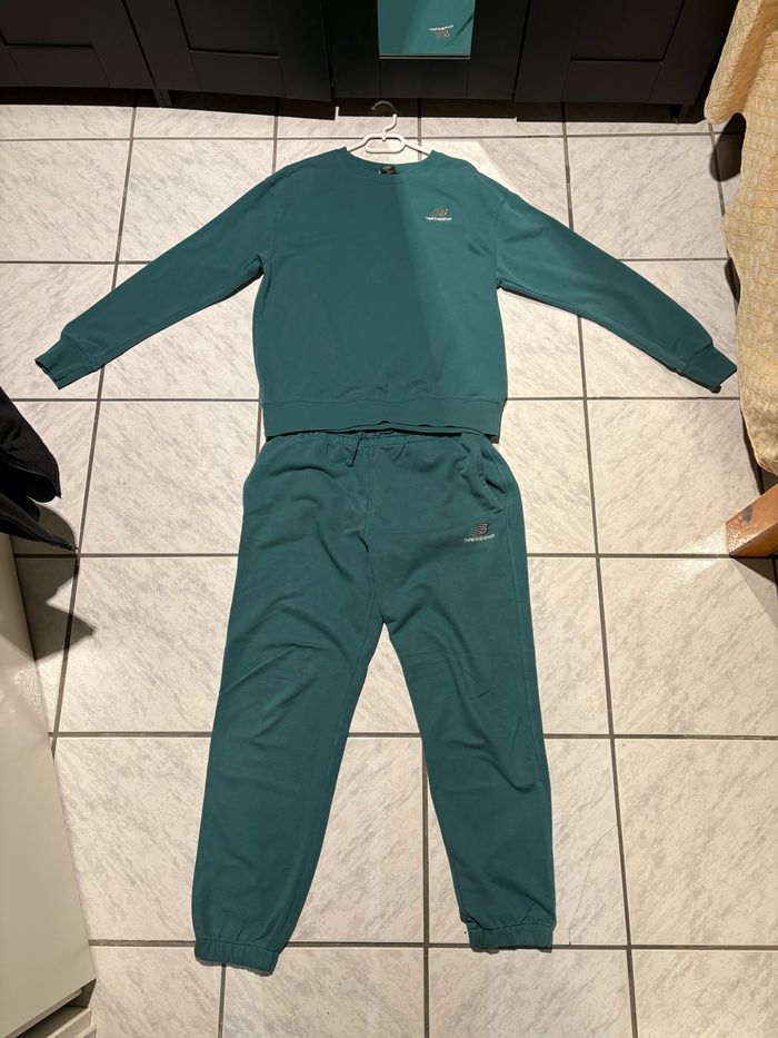 Ensemble New Balance vert, composé d’un jogging et d’un sweat à manches longues, parfait pour un look sportwear ou casual.