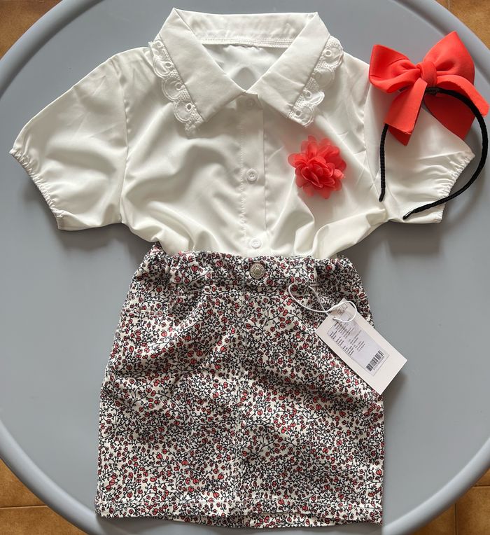 Ensemble jupe en jean taille réglable fleurie liberty Name It, chemisier blanc à liseré dentelle et fleur poitrine (sans marque), serre tête assorti gros noeud