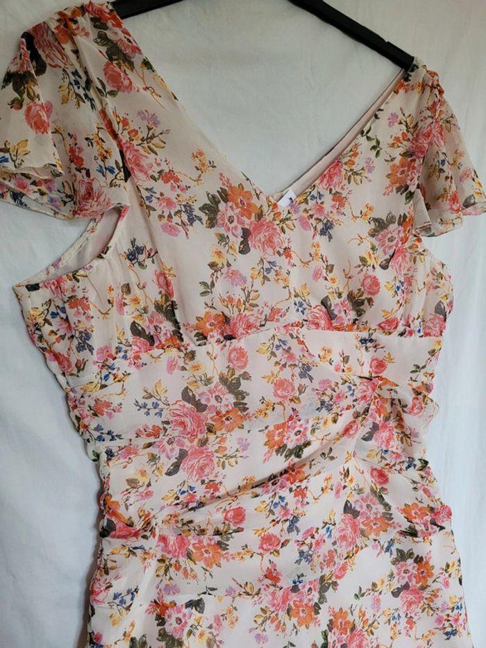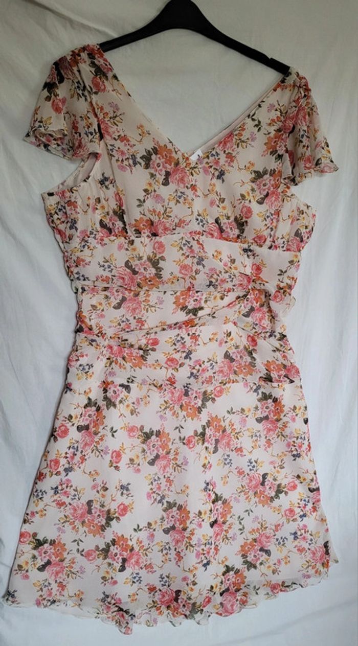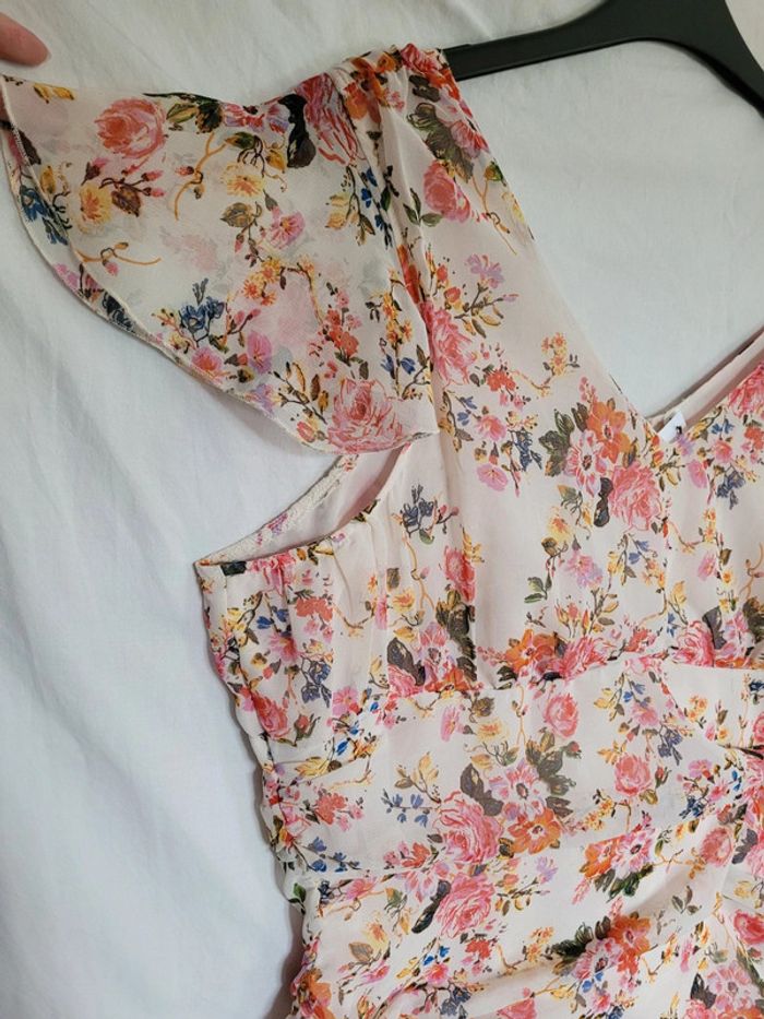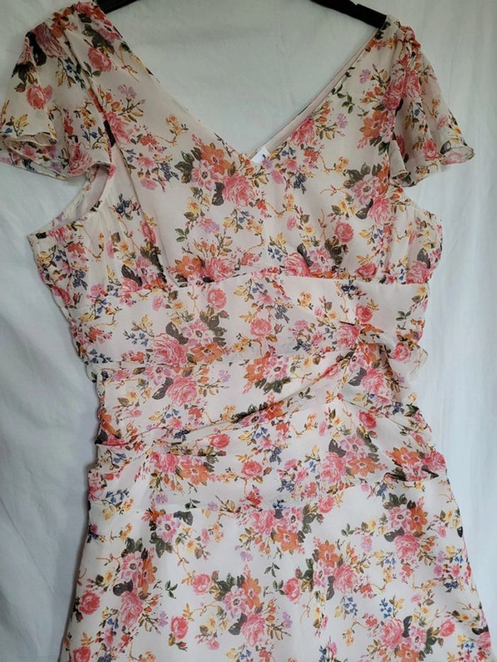 Bonjour Je vends cette jolie robe d été romantique toute doublée. Détails soignés : tissu flouté sur le ventre, découpe sous poitrine, petite manches volantées, jolie ampleur de jupe. Tissu non extensible, voilage, superposé sur une doublure unie. Mesures Aisselle à aisselle 59 Taille 50 Hanche 59 Du haut des épaules au bas de la jupe 114 Taille 50 italienne soit 46 français, ce que j indique.