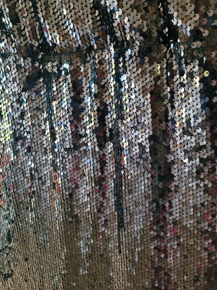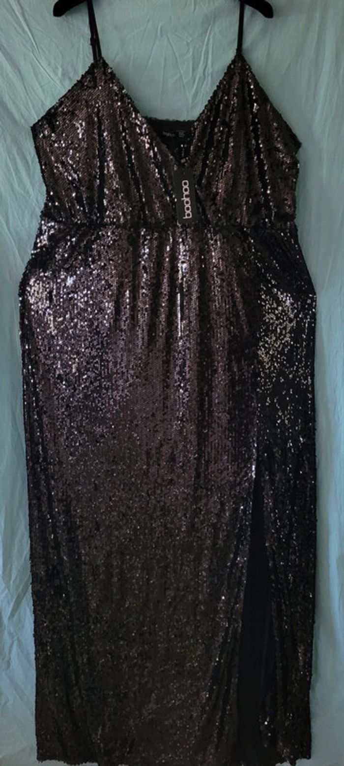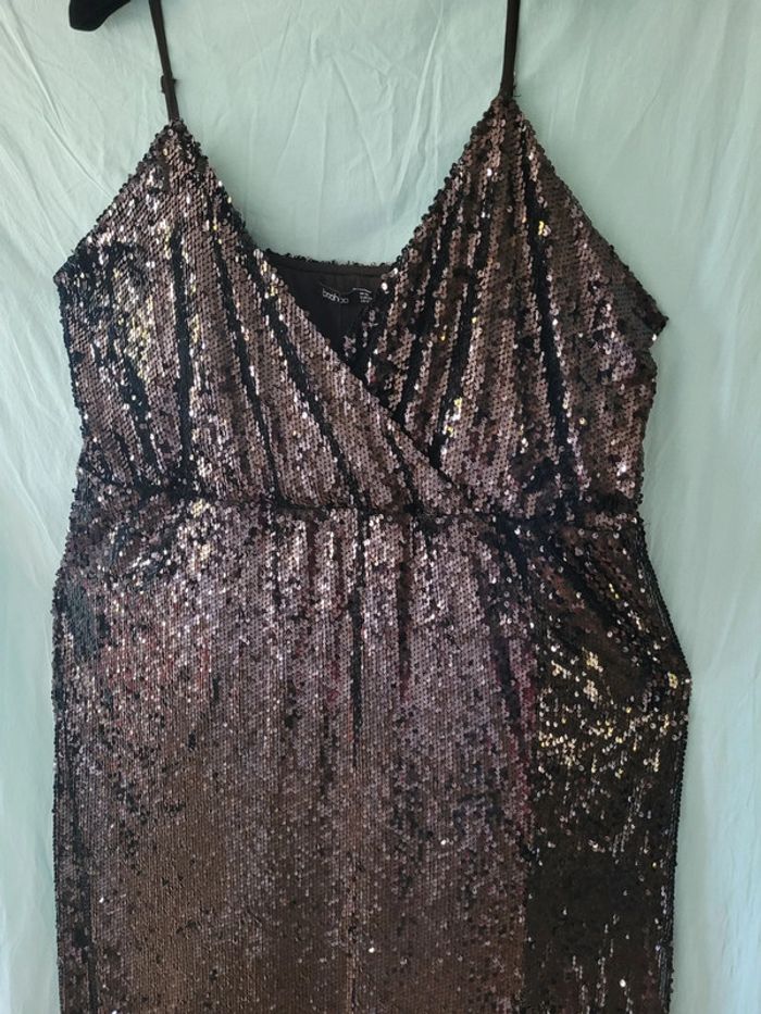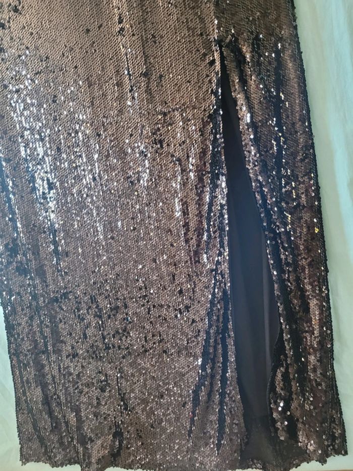 Bonjour Je vends cette sublime robe de soirée entièrement couverte de sequins noirs parfaitement neuve puisque vendue avec son étiquette Entièrement doublée Jolie forme flatteuse avec la taille resserrée et un grand décolleté croisé qui flatte toutes les poitrines Bretelles fines réglables Grande fente sur le bas jusqu'à au-dessus du genou Tissus extensibles confortables à porter Une robe qui saura à coup sûr vous faire sentir la star de la soirée ! Prix d achat 69€ Mesures Aisselle à aisselle 64 à 79 Taille 60 à 73 Hanches 80 à 92 Du haut des épaules au bas 170cm Taille 52 européen donc 54 français Famille soignée sans animaux et non fumeur