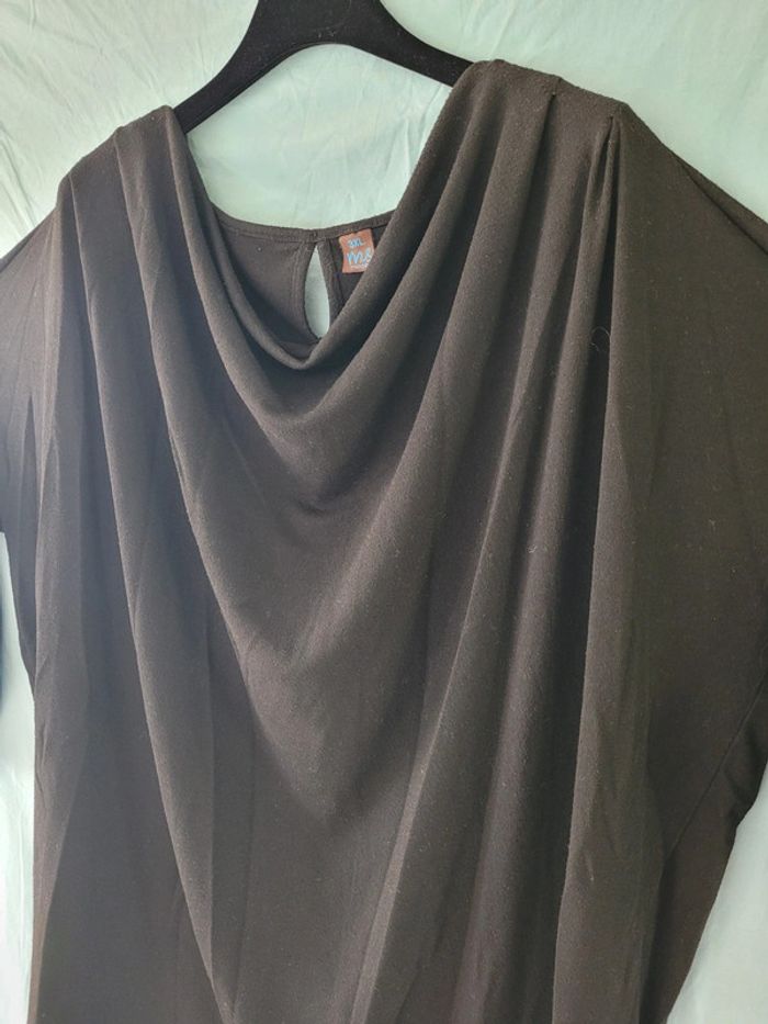 Bonjour Je vends ce pull MS Mode noir très confortable. Petite goutte au dos fermée par un faux bouton métallique. Belle ampleur et plissés sur les épaules qui donnent un drapé flatteur sur la poitrine. Mesure d aisselle à aisselle 83 à 101 Du haut des épaules au bas 86 cm Famille soignée sans animaux et non fumeur