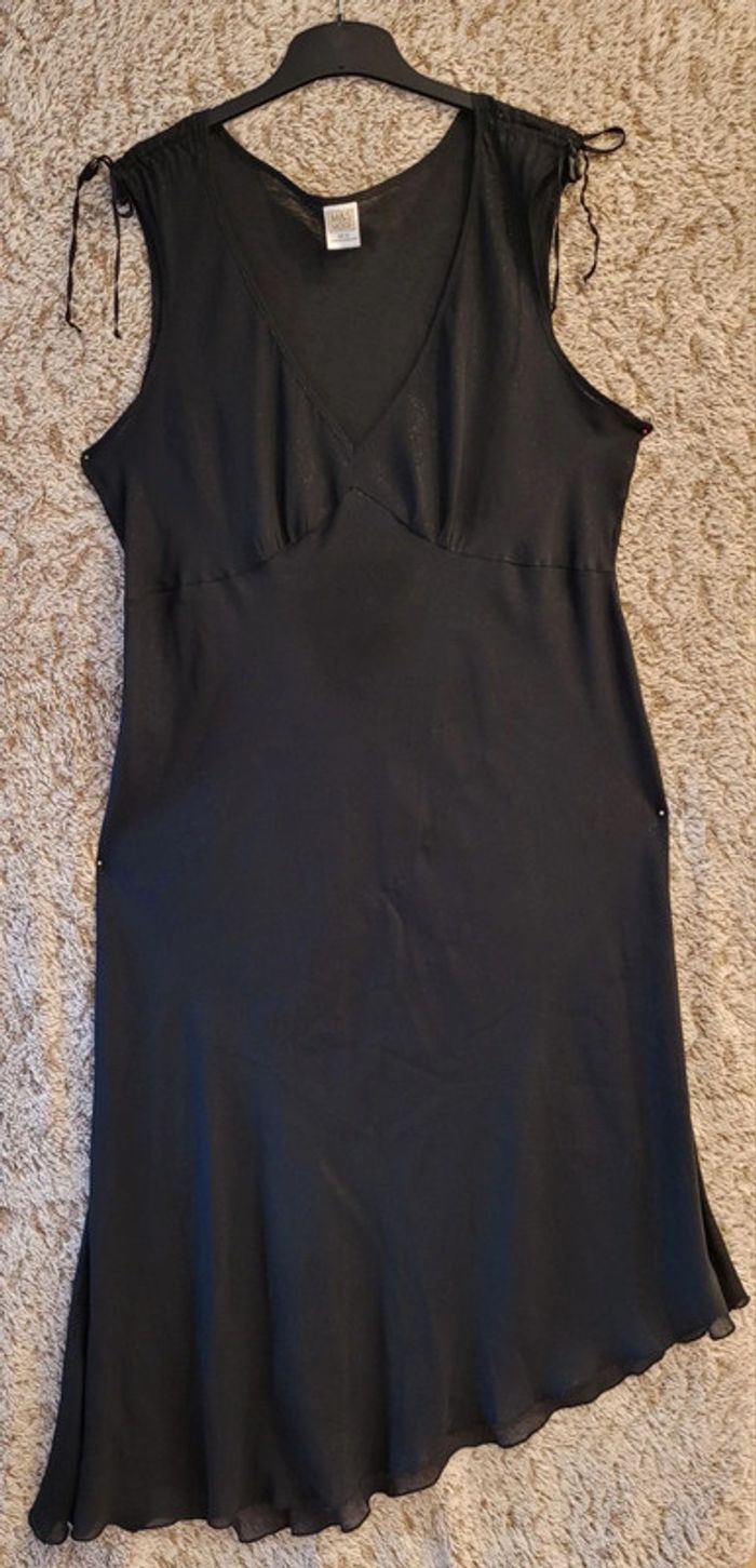 Bonjour, Je vends cette très belle robe noire à la coupe soignée et au tissu subtilement pailleté. Jolie découpe sous poitrine, épaules froissables par un lien de serrage qui retombe joliment sur les épaules, bas asymétrique légèrement volanté. Une robe facile à porter en toutes occasions, flatteuse et sensuelle, à associer à un fond de robe noir ou coloré, une veste chic ou un gilet décalé. Une alliée dans la valise pour vos soirées estivales : elle ne pèse rien ! Mesures : Aisselle à aisselle jusqu à 74 Taille jusqu à 70 Hanches jusqu à 80 Indiquée taille européenne 52, elle devrait faire un 54 français mais je la pense plus adaptée à un 52, ce que j indique.