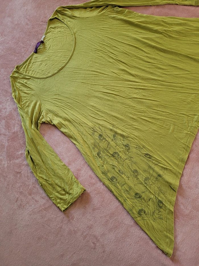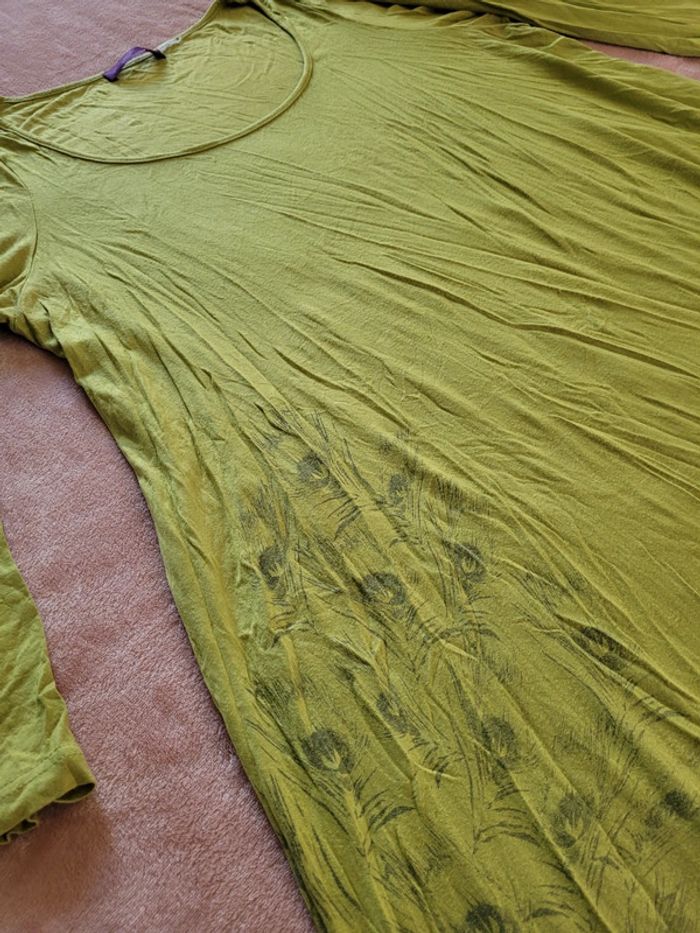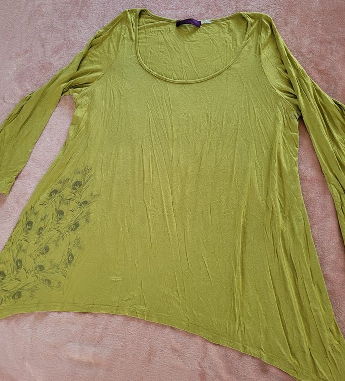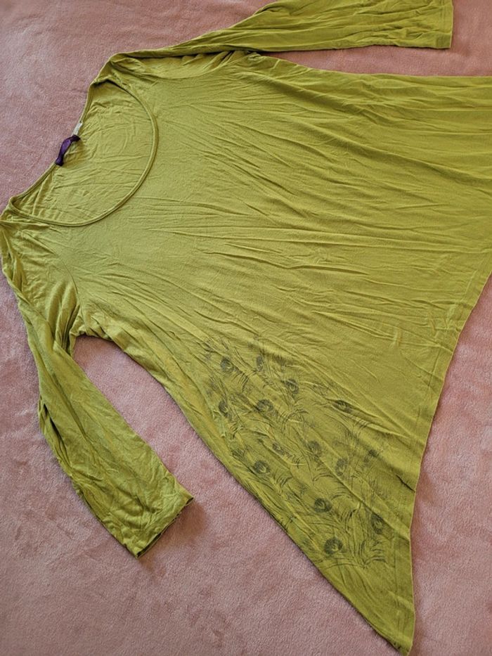 Bonjour Je vends ce long tee shirt souple et tout doux de chez Taillissime, conçu notamment pour flouter les hanches et bien couvrir le bidou et les fesses. Un tee shirt dans lequel on se sent bien !! Couleur tilleul très tonique, motif de plumes de paon discret sur un côté.