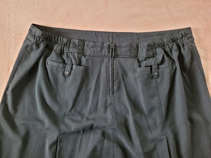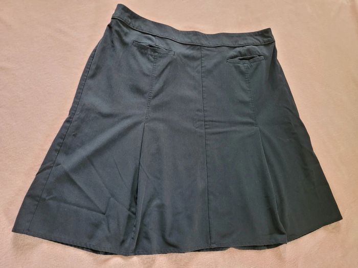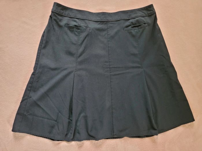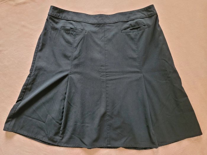 Bonjour, Je vends cette sympathique jupe noire façon jean aux lignes classiques avec des détails modernes comme les boutonnages au dos ou les fines poches plaquées devant. Bien coupée Ceinture élastiquée en partie pour avoir du confort sans altérer l esthetique. Belle longueur Très confortable et facile à porter en toutes occasions ! Taille 58-60 Vendue avec son bouton de secour