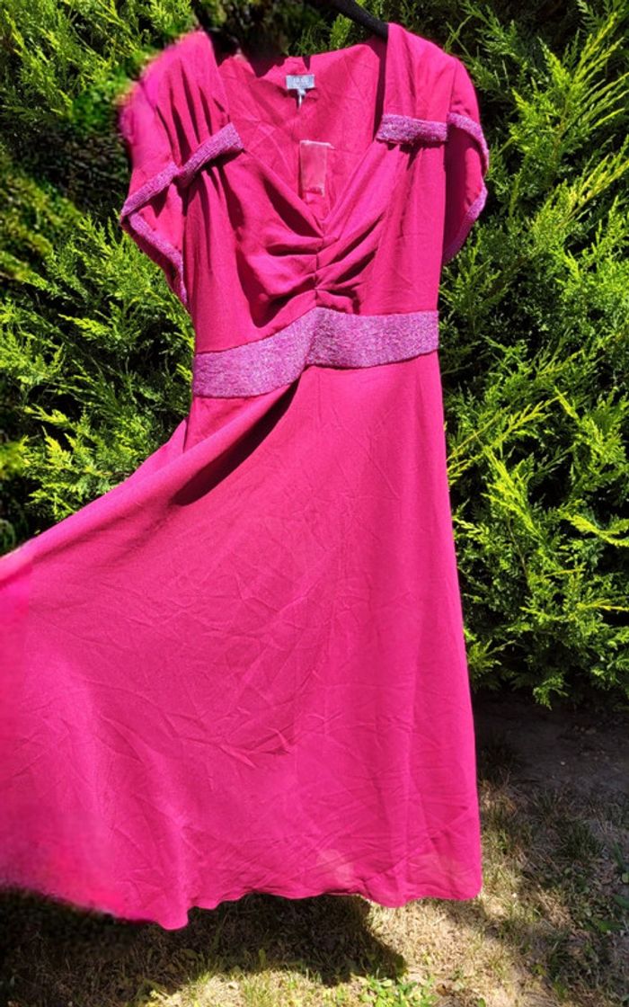 Bonjour, Je vends cette superbe robe neuve à la riche couleur grenat/framboise, au tombé magnifique et aux empierrements sophistiqués. Fausse ceinture intégralement brodée de perles, et rubans se nouant au dos pour l adapter à votre morphologie. Joli décolleté froncé flatteur, réhaussé de deux barettes brodées de perles. Joli jeu de volants sur les épaules, soulignés là encore de perles brodées. Belle ampleur de la jupe avec un tombé impeccable. Intégralement doublée. Vendue avec son sachet de perles de secours. Parfait état, aucune perle manquante : la robe est neuve. Mesure d aisselle à aisselle 60cm Taille 55cm