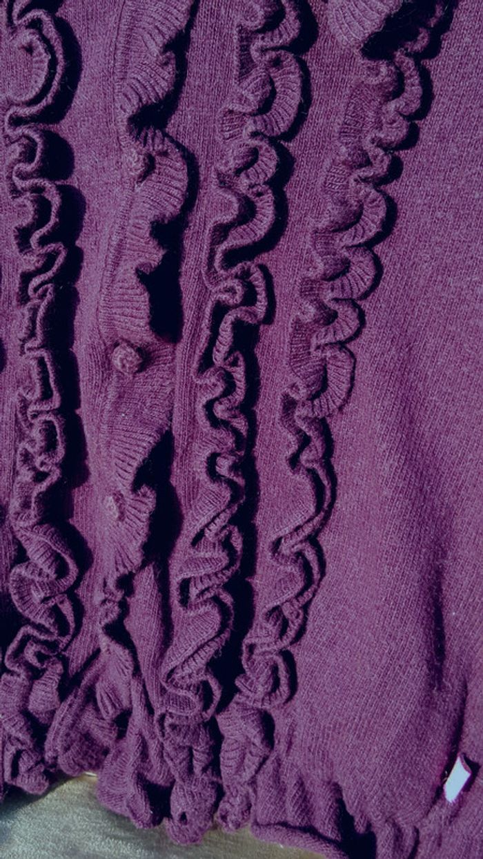 Tres beau gilet Jean Bourget tres doux d une jolie couleur aubergine. Finitions soignees : jabots, poignets volantés, boutons couverts... Première main en tres bon état Famille soignee et soigneuse sans animaux et non fumeur