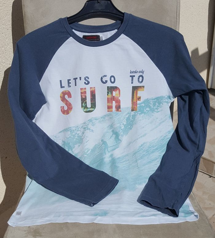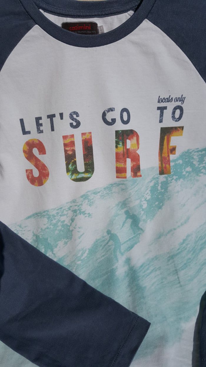 Beau tee-shirt manches longues bleu et blanc de la marque Catimini. Belles finitions. Taille 14 ans. Très bon état. Famille soignée et soigneuse, non fumeur et sans animaux.