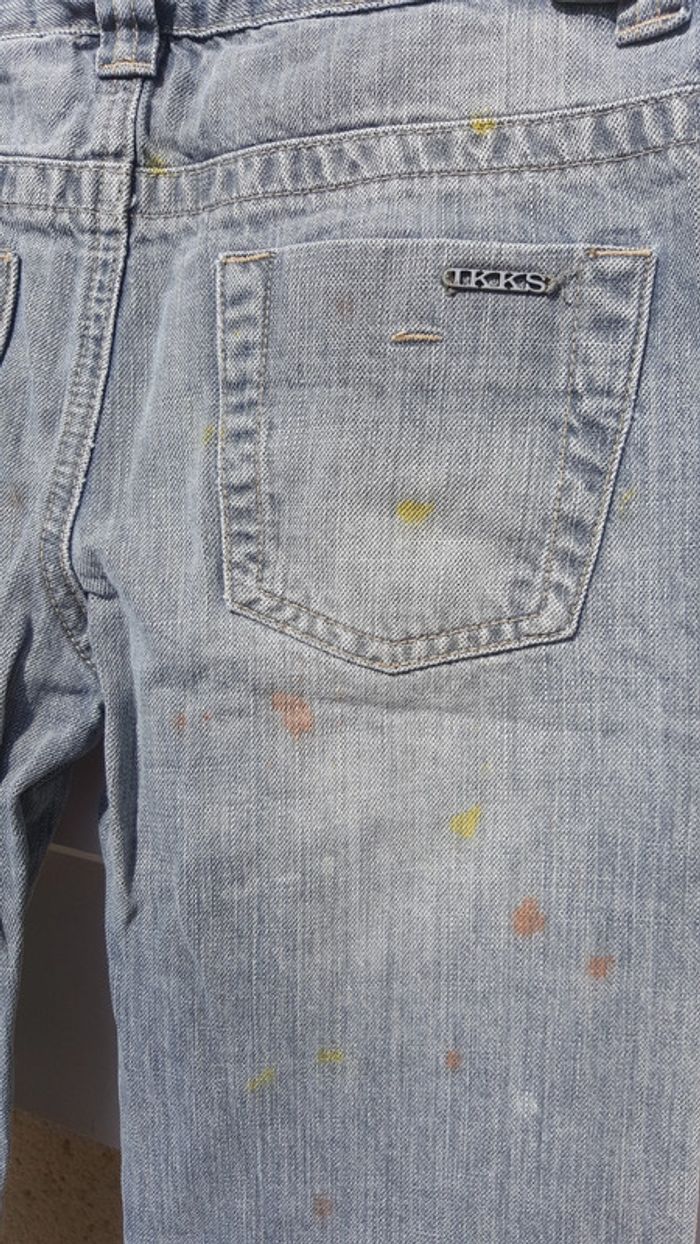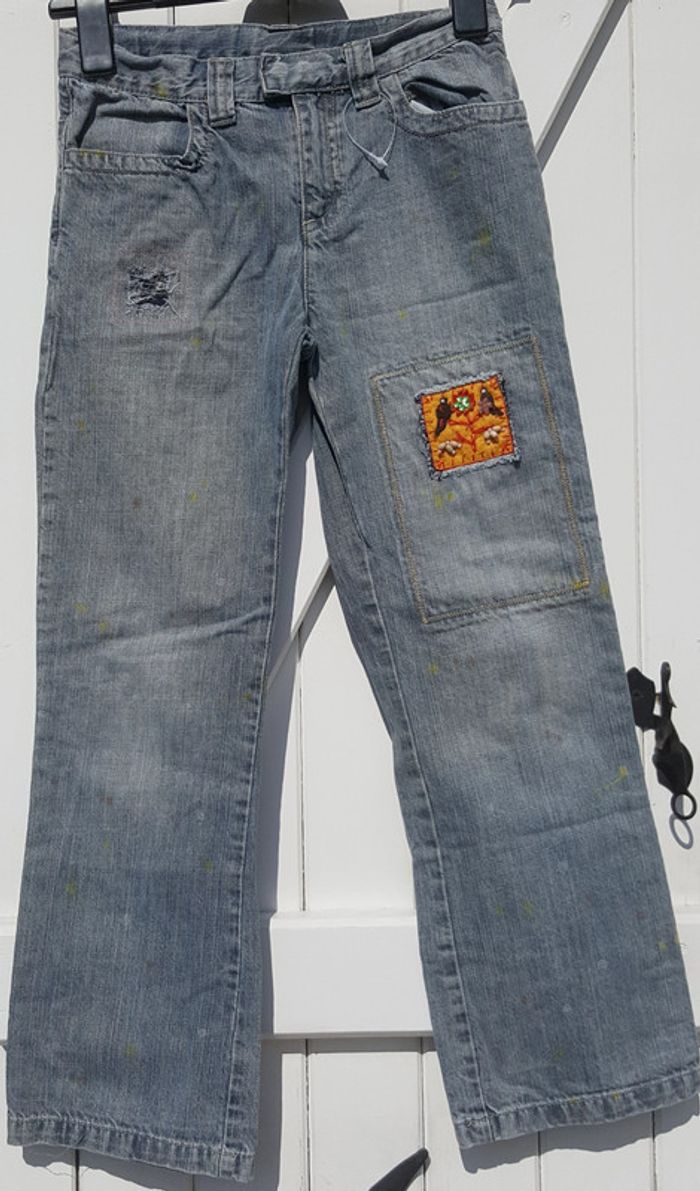 Jean IKKS 10 ans tres original puisque volontairement troué et tâché avec des spots de couleurs. Motif contrastant sur le devant avec sequins et perles. Excellent état comme neuf Famille soigneuse sans animaux et non fumeur