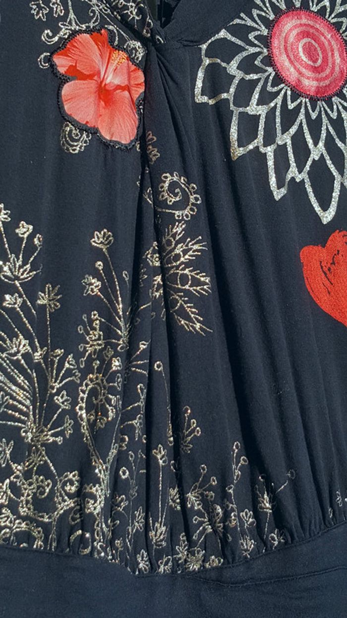 Tres jolie robe courte bleu marine Desigual avec motifs floraux, perles sequins et dentelle délicate sur les épaules. Elle est tres jolie et élégante. Premiere main en tres bon etat. Notez que c est un petit XL comme souvent chez Desigual. Famille soignee et soigneuse sans animaux et non fumeur.