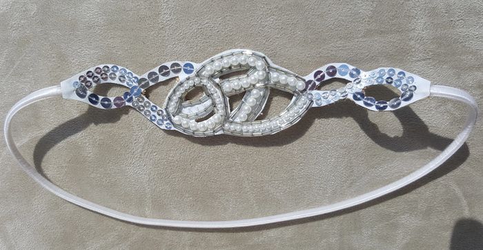 Tres beau bijou de tête Eliane et Léna blanc à perles et sequins monté sur un élastique blanc permettant de l utiliser en serre-tete. Taille unique Premiere main en parfait état tres peu porté. Famille soignee et soigneuse sans animaux ni fumeur.