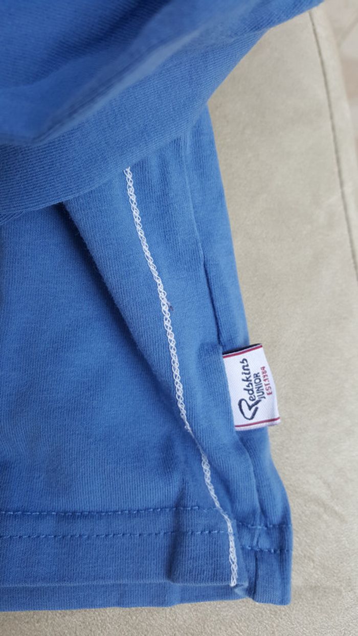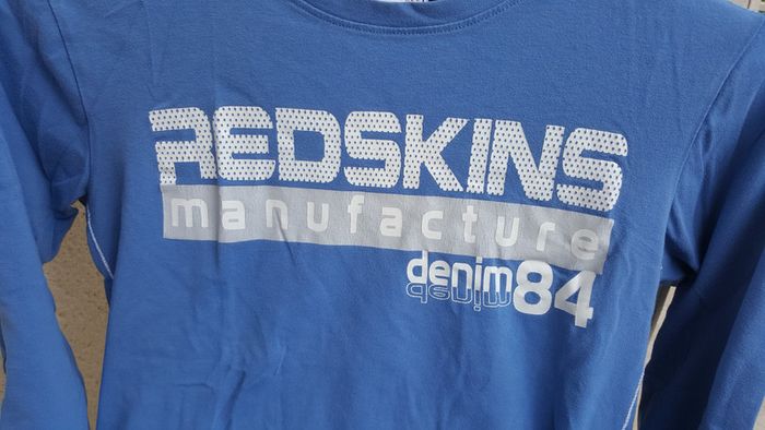 Beau tee-shirt bleu manches longues de marque Redskins avec inscriptions. Taille 12 ans. Très bon état. Première main. Famille soignée et soigneuse non fumeur et sans animaux.