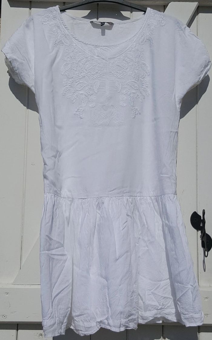 Jolie robe tunique legere brodee sur le devant. Tres fluide, facile à porter et agreable. Rend vraiment bien sur une peau bronzee ! 😉 Premiere main en parfait etat. Famille soignee et soigneuse sans fumeur et sans animaux