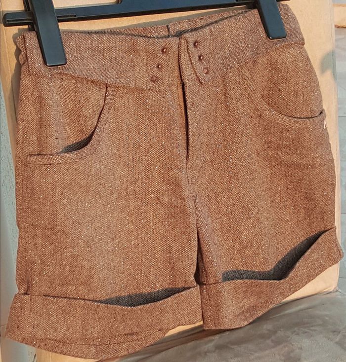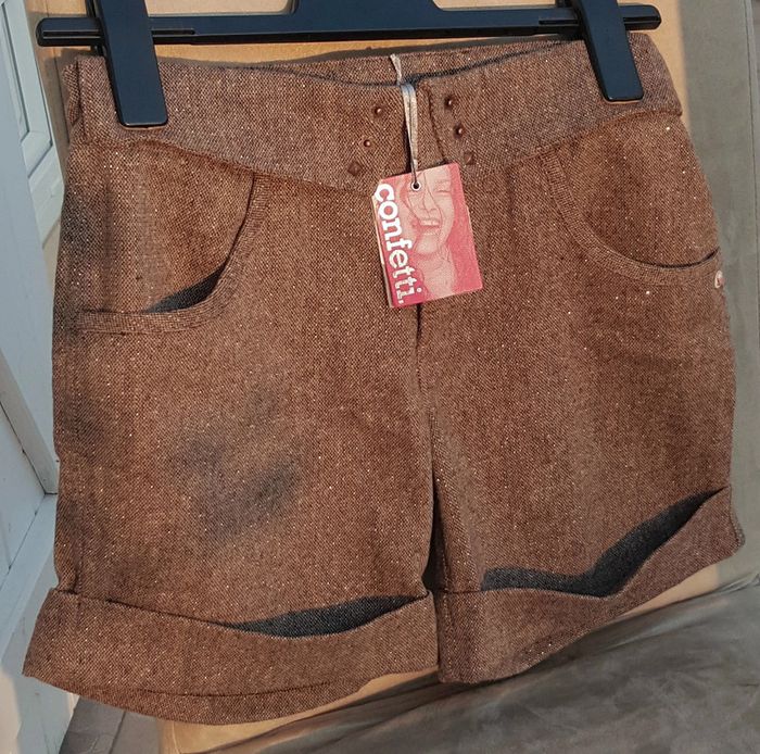 Magnifique short Confetti avec plein de détails soignés et féminins, tissu façon tweed. Absolument neuf, avec son étiquette d achat. Famille soigneuse sans fumeur ni animaux