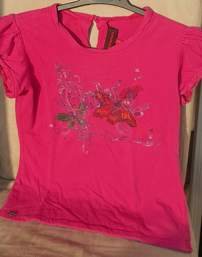 joli tee-shirt Catimini brodé avec sequins et motif papillon sur le devant. Manches bouffantes. article de première main. famille soignée et soigneuse, sans animaux et non fumeuse.