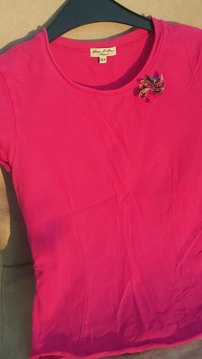 tee shirt rose fuchsia Eliane et Léna, en tissu élastique très confortable. Je vends également la robe assortie ainsi que le fichu. article de première main famille soigneuse et soignée, non fumeur et sans animaux